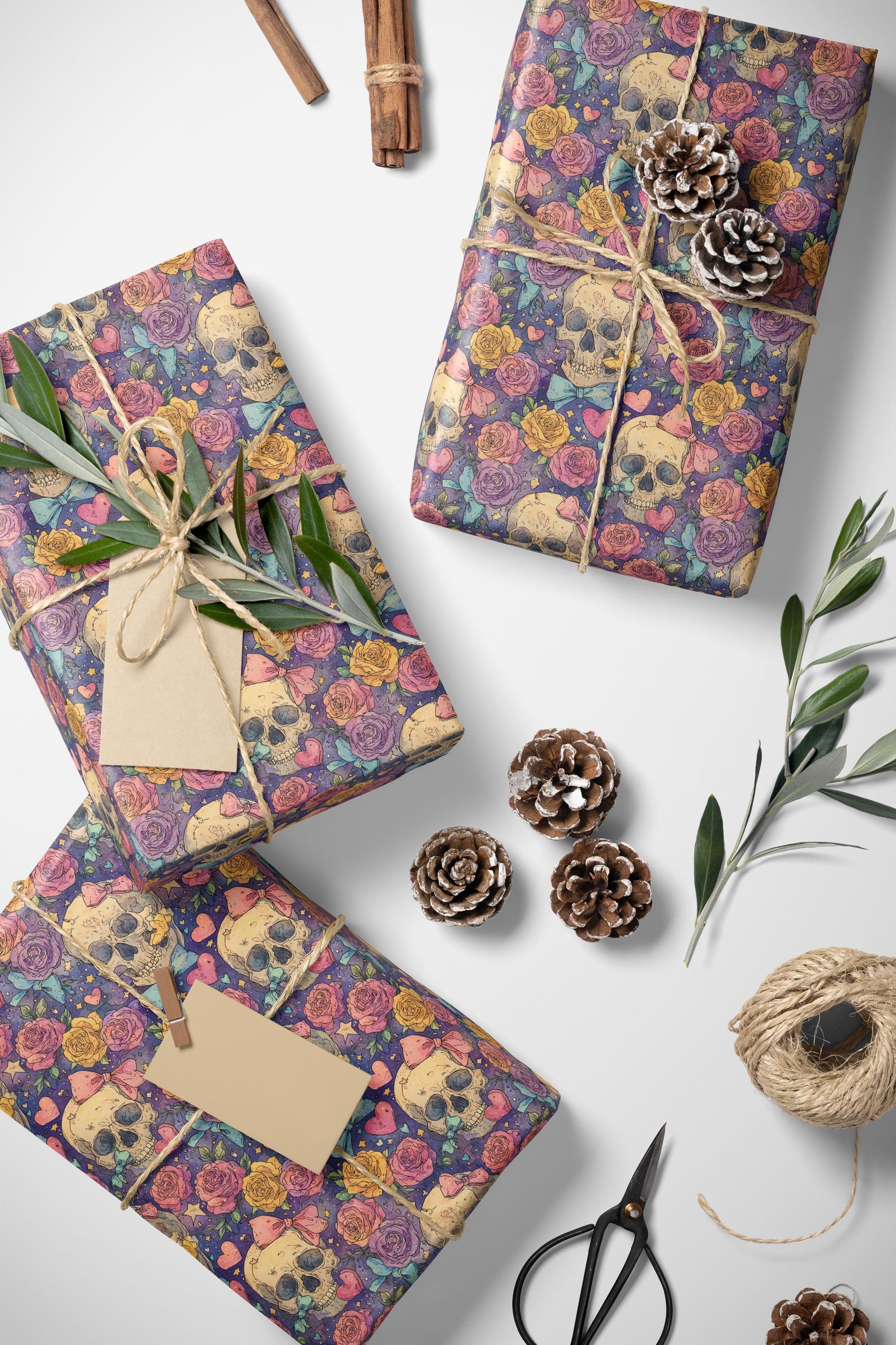 Pastel Goth Halloween Wrapping Paper Roll Watercolor Creepy Cute Skulls and Roses Witch Moon Pattern #15