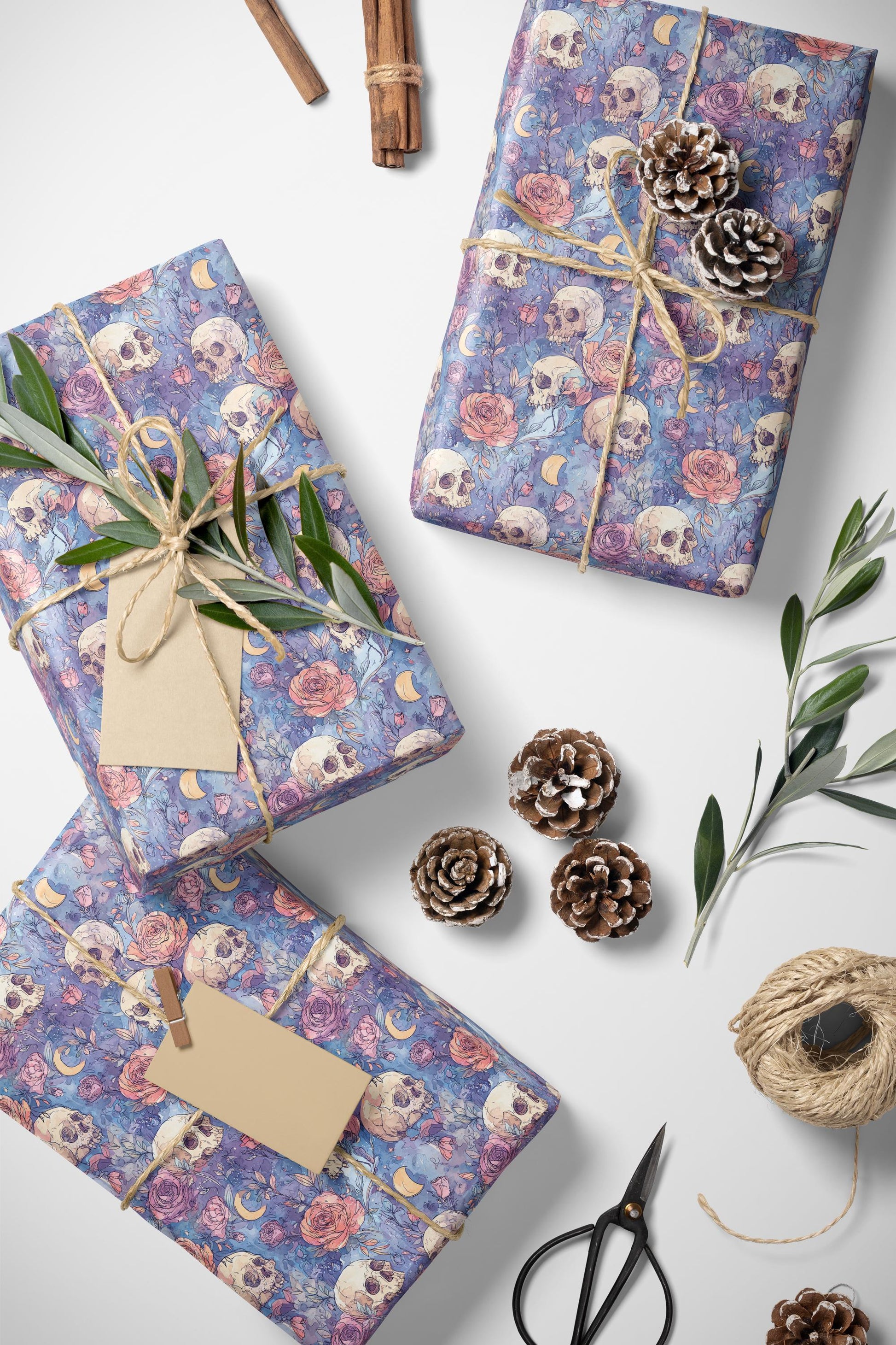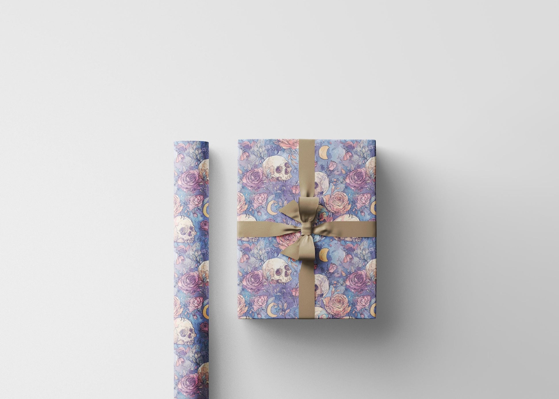 Pastel Goth Halloween Wrapping Paper Roll Watercolor Cute Spooky Ghost Bat Moon Stars Design #9