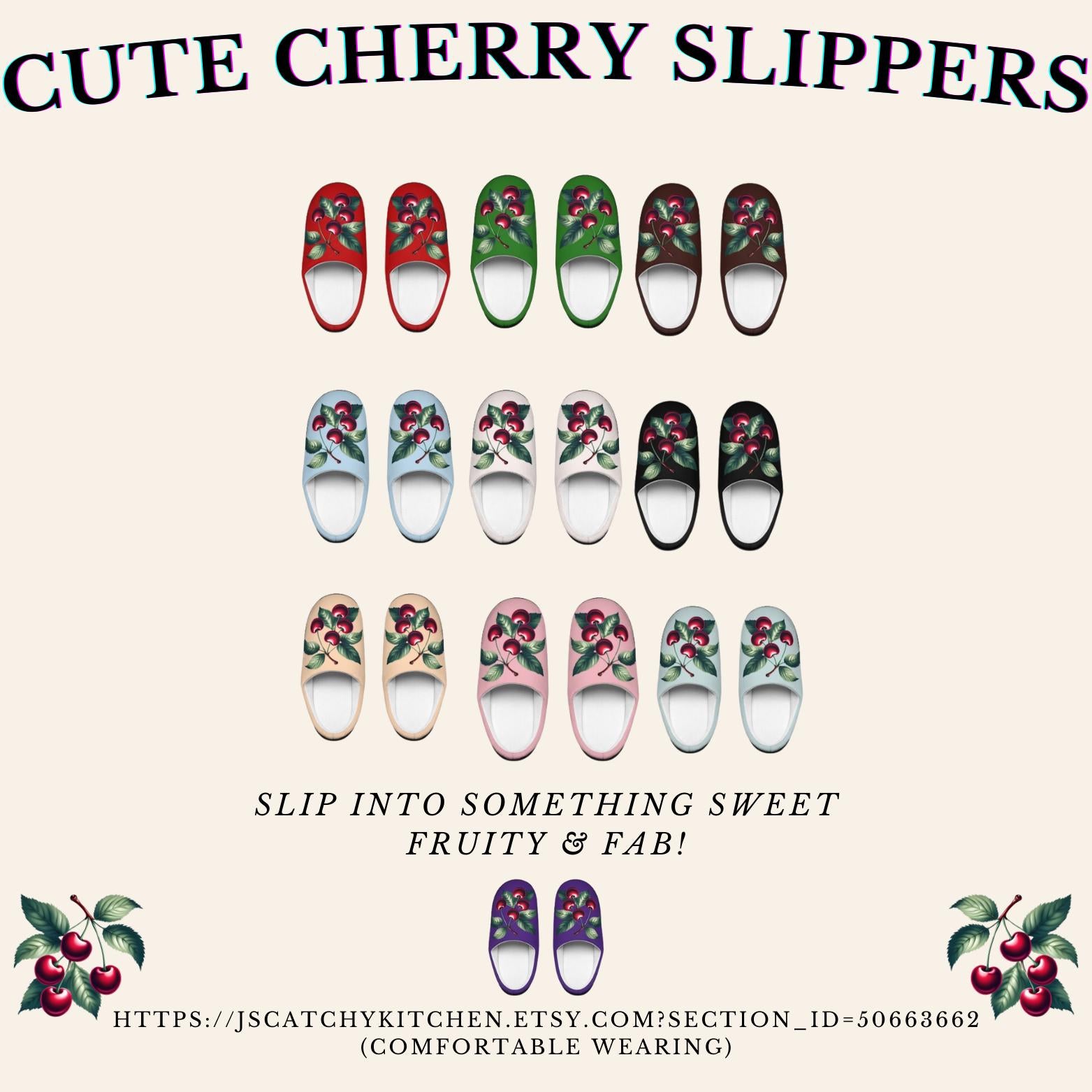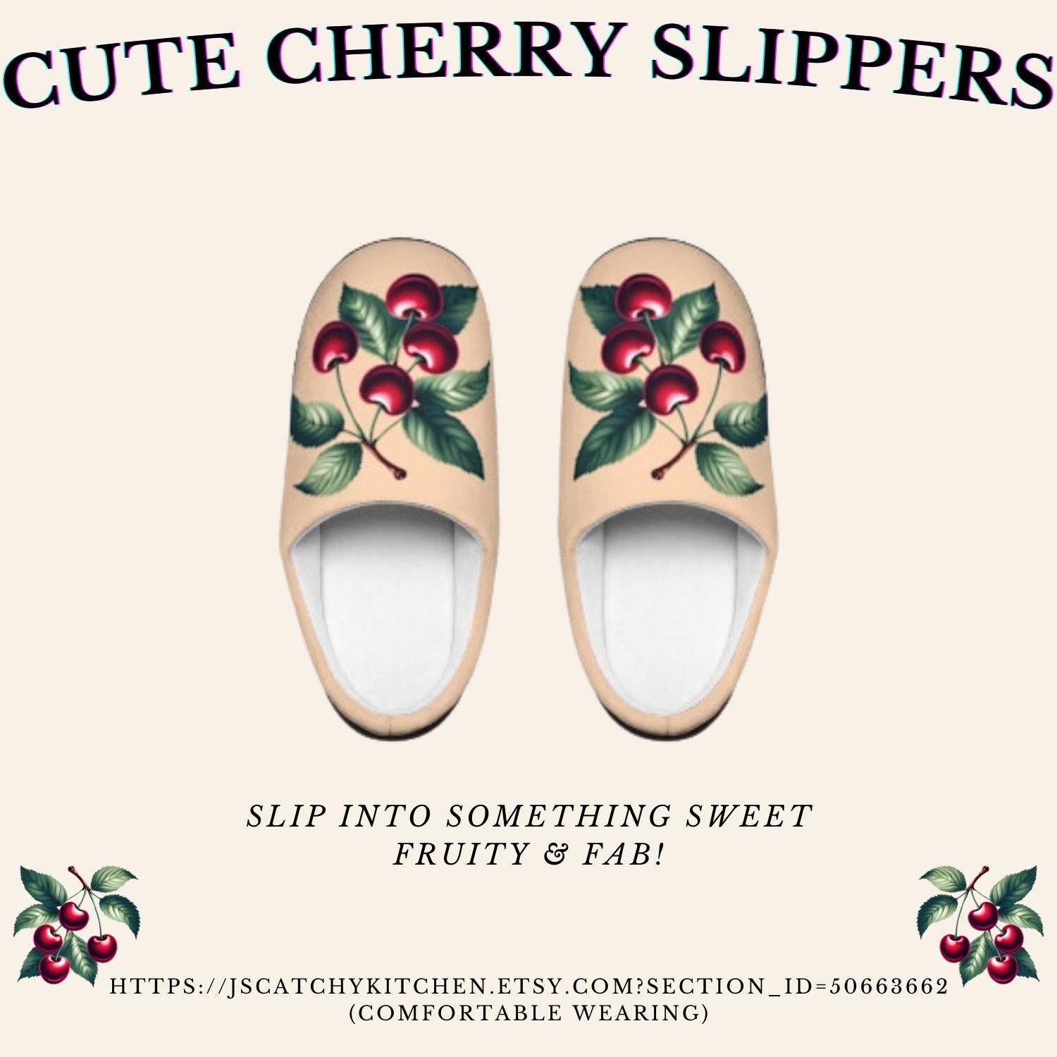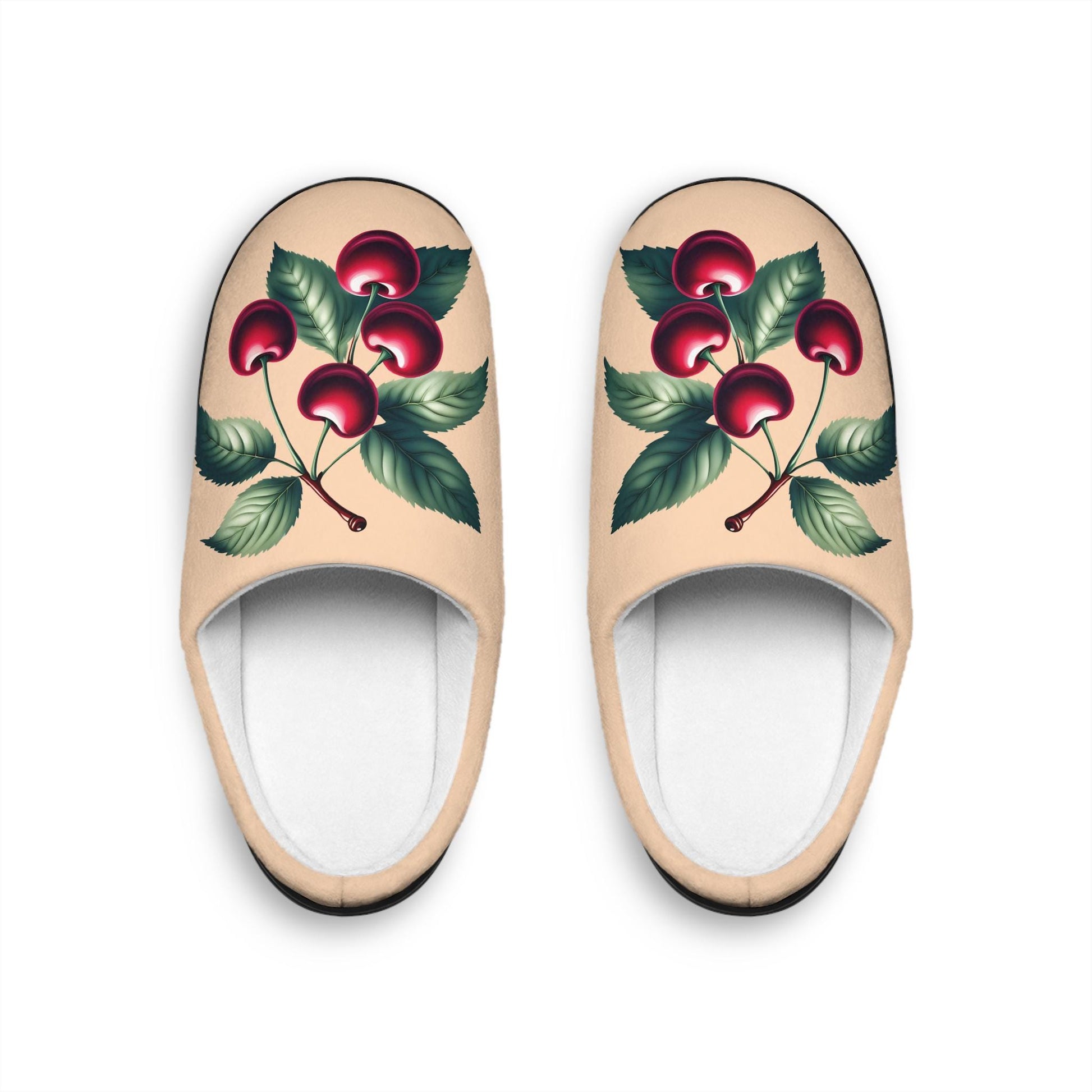 Peachy-Colored Women's Slippers with Dark Red Cherry Toile Design | Soft Fleece, Anti-Skid Black Rubber Soles | Cozy and Stylish HouseShoes