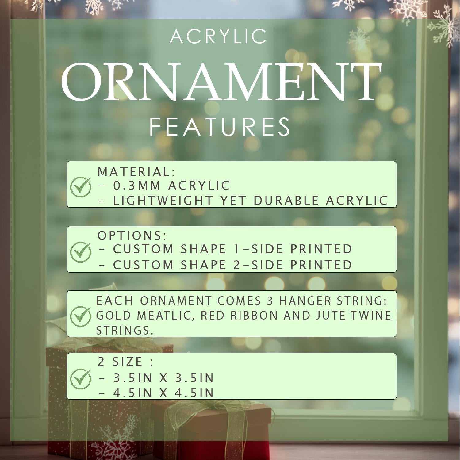 - 🔮 Acrylic (Mica) Ornaments — lightweight 2D flat, glossy, double-sided vibrant printing