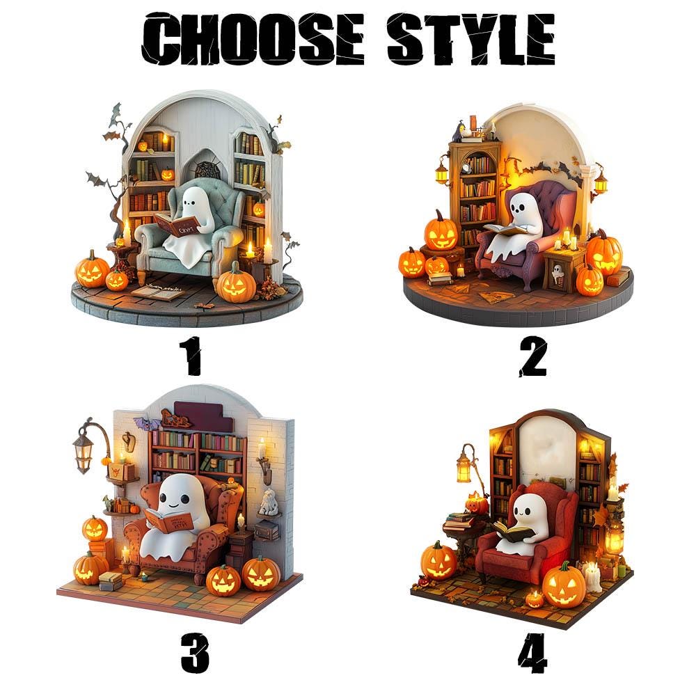 Personalized Halloween Window Hanging, Cute Ghost Reading Nook Decor with Pumpkins and Book, Fall Spooky Room Decoration Gift for Book Lover