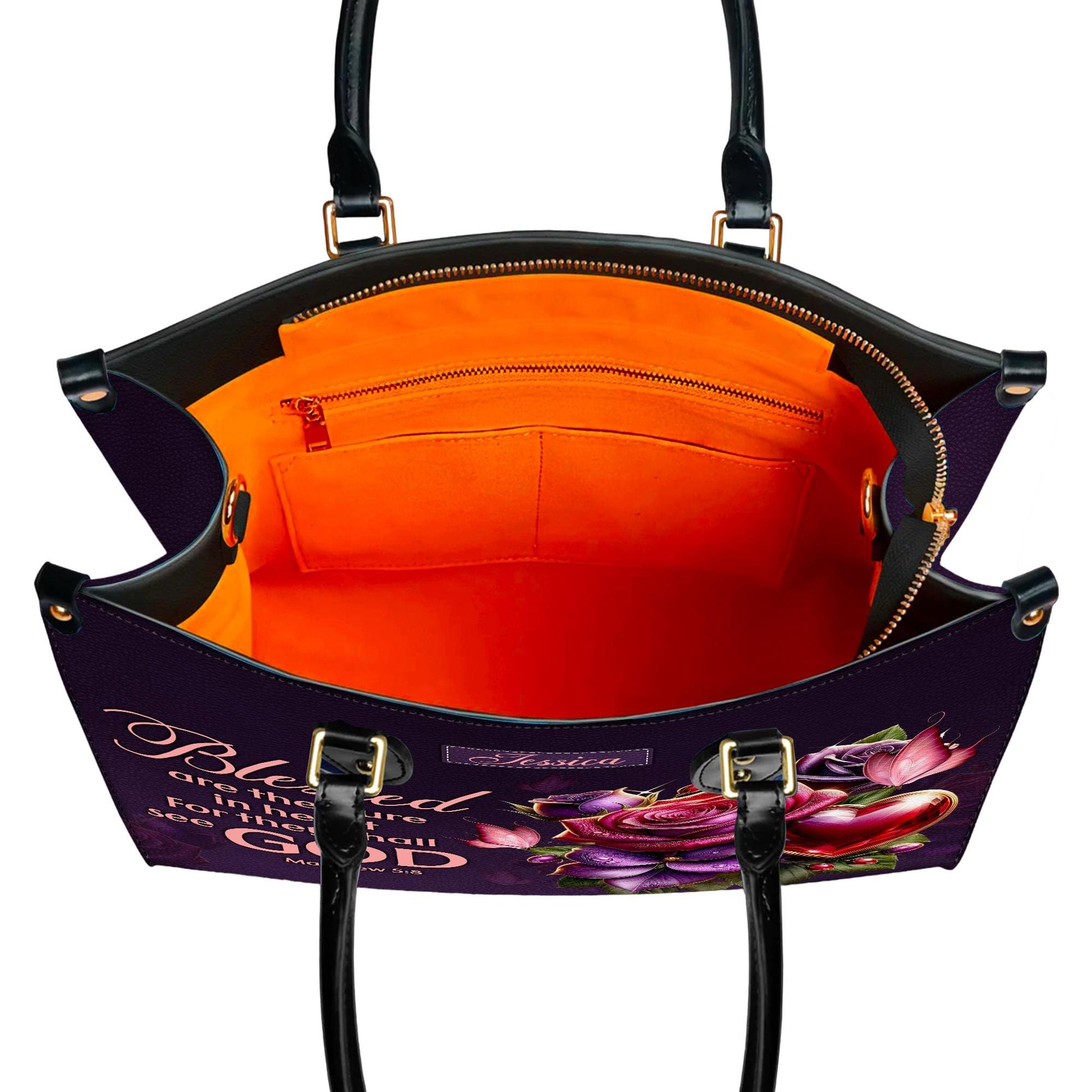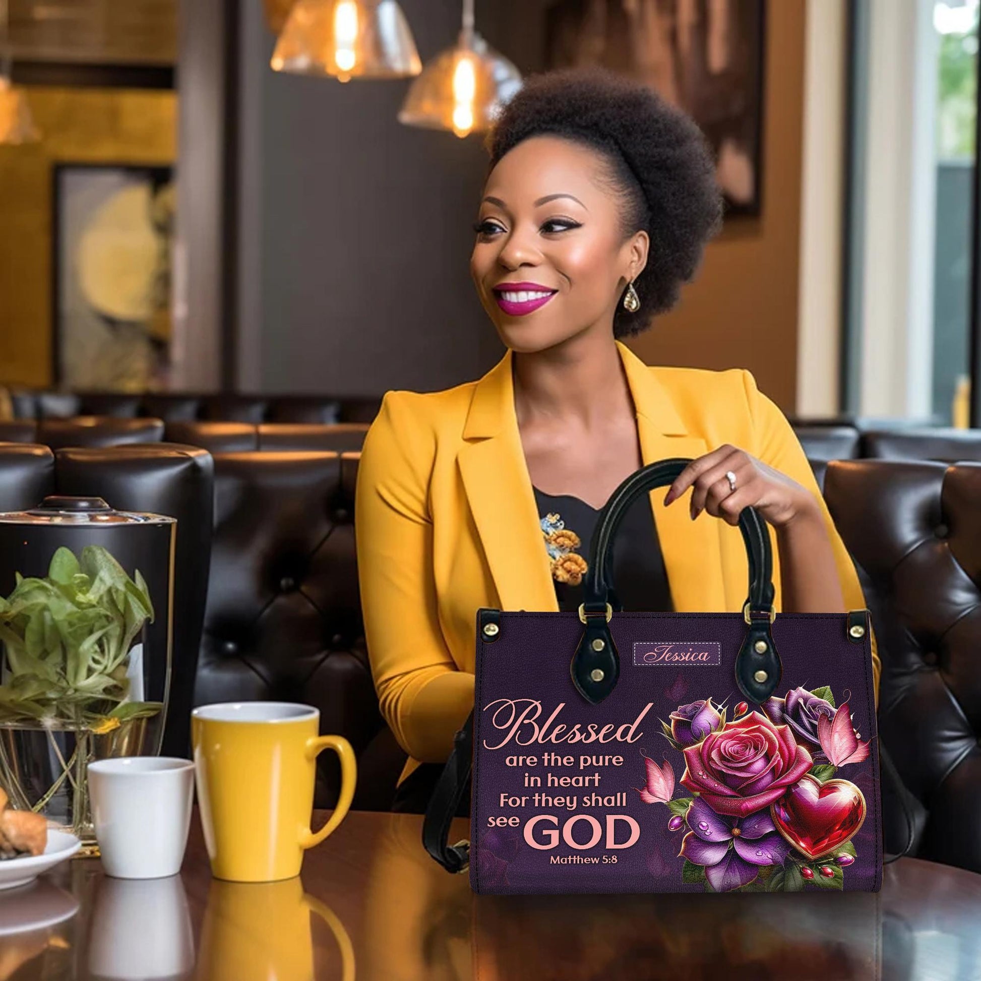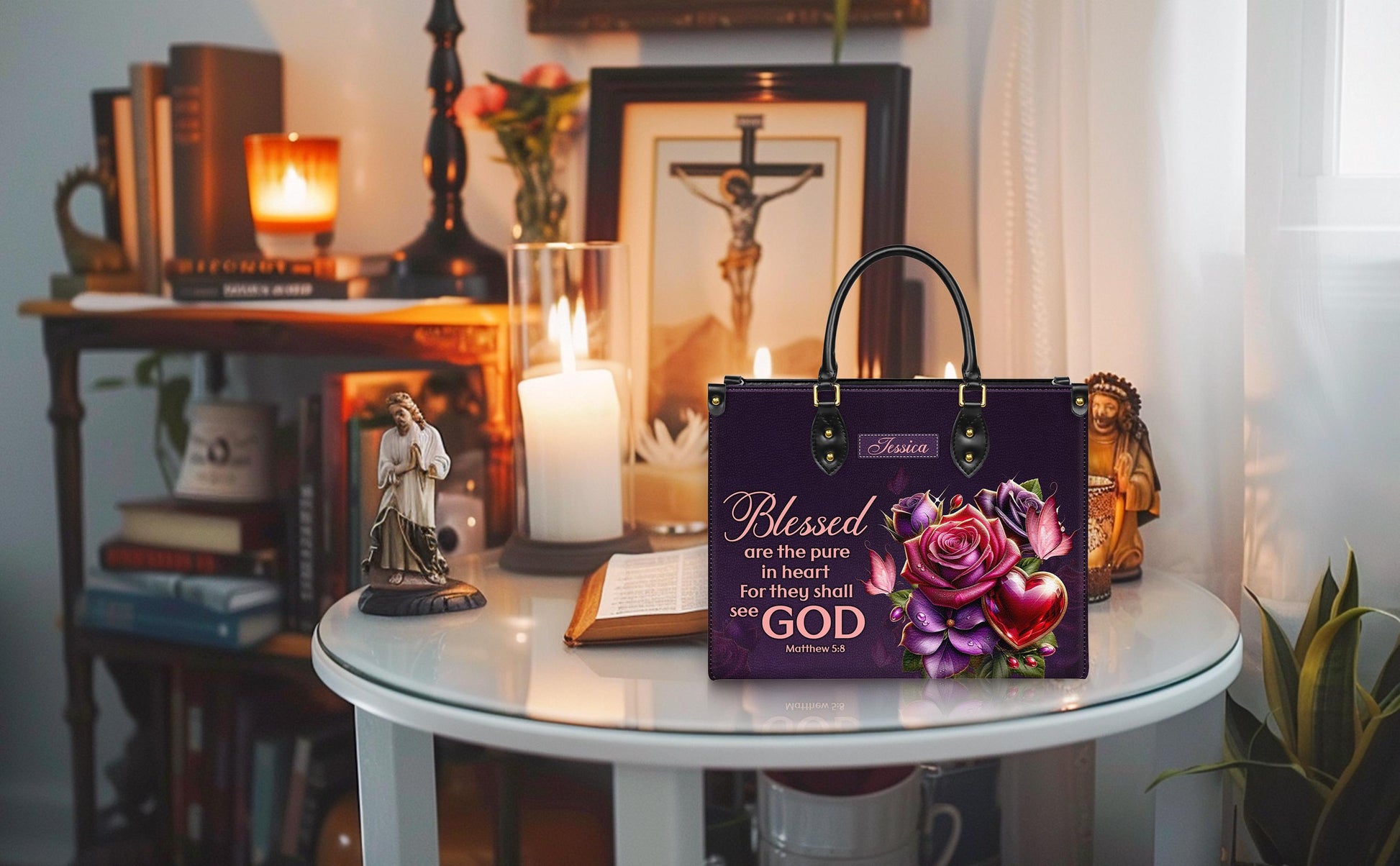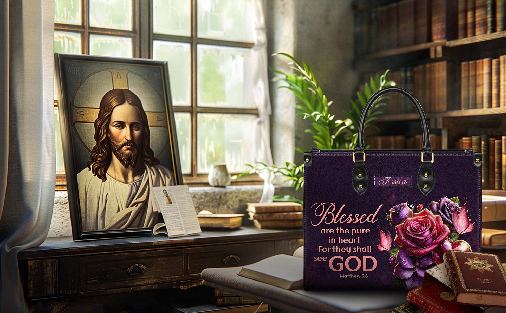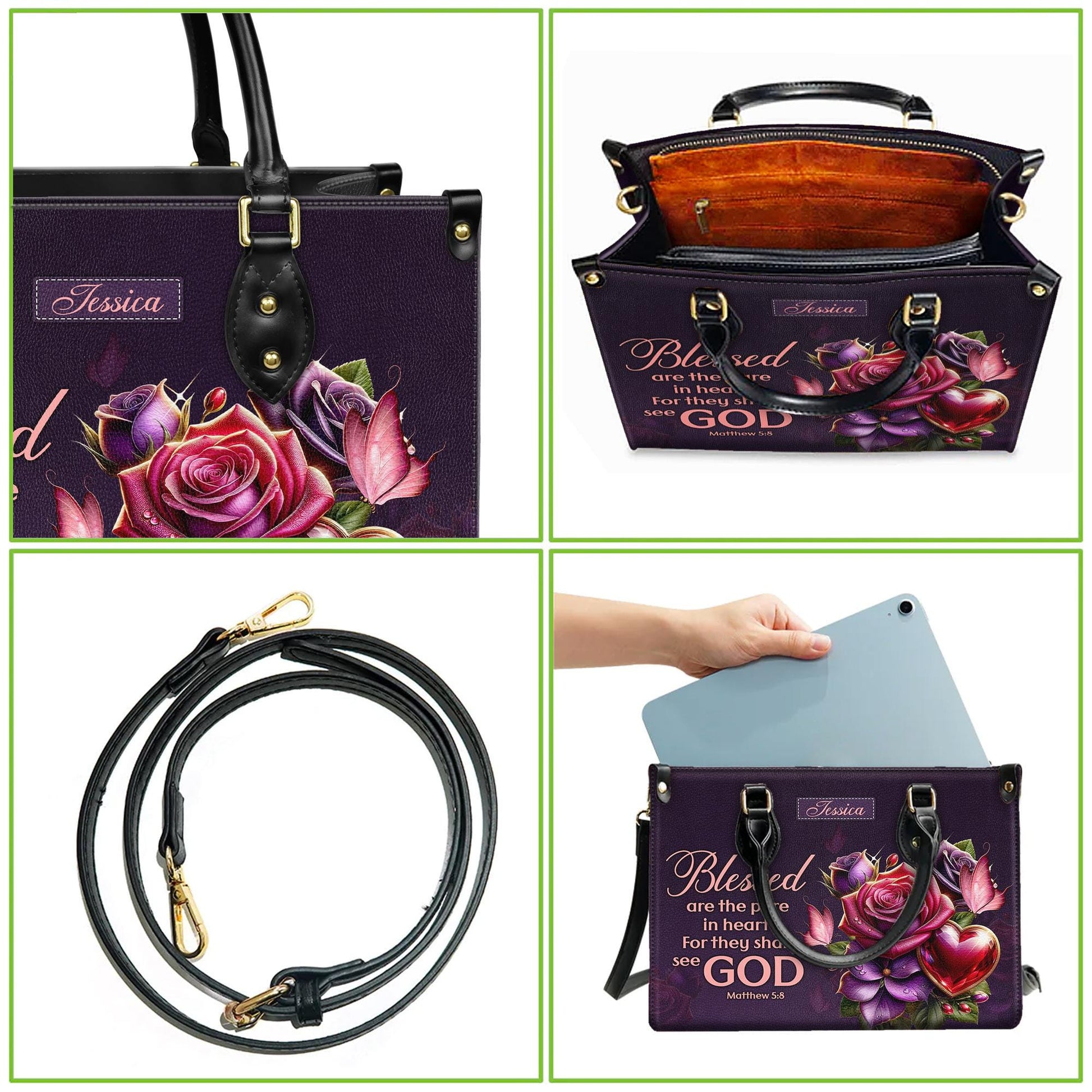 Personalized Leather Handbag Custom Name, Christian Gift, Gifts for Women, Blessed Are the Pure in Heart Bag, Rose & Heart Design