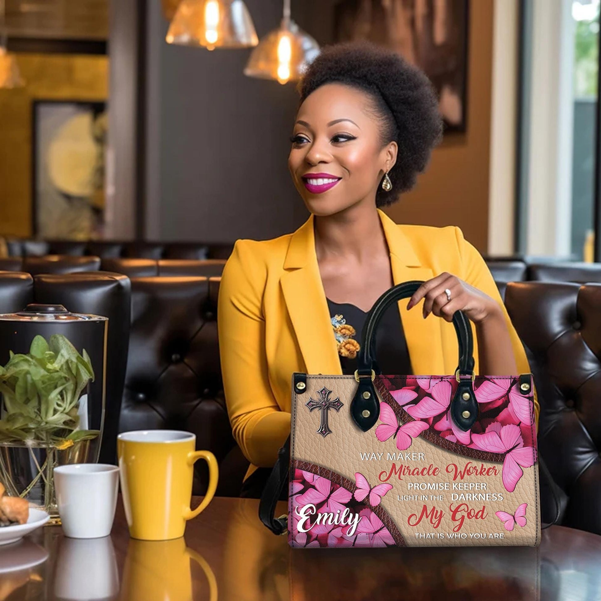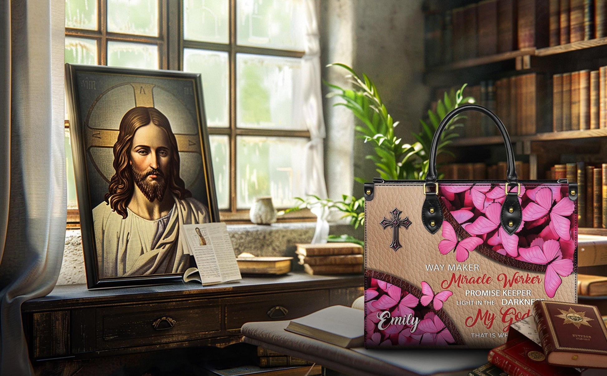 Personalized Leather Handbag Custom Name, Christian Gift, Gifts for Women, Way Maker Miracle Worker Bag, Pink Butterfly & Cross Design