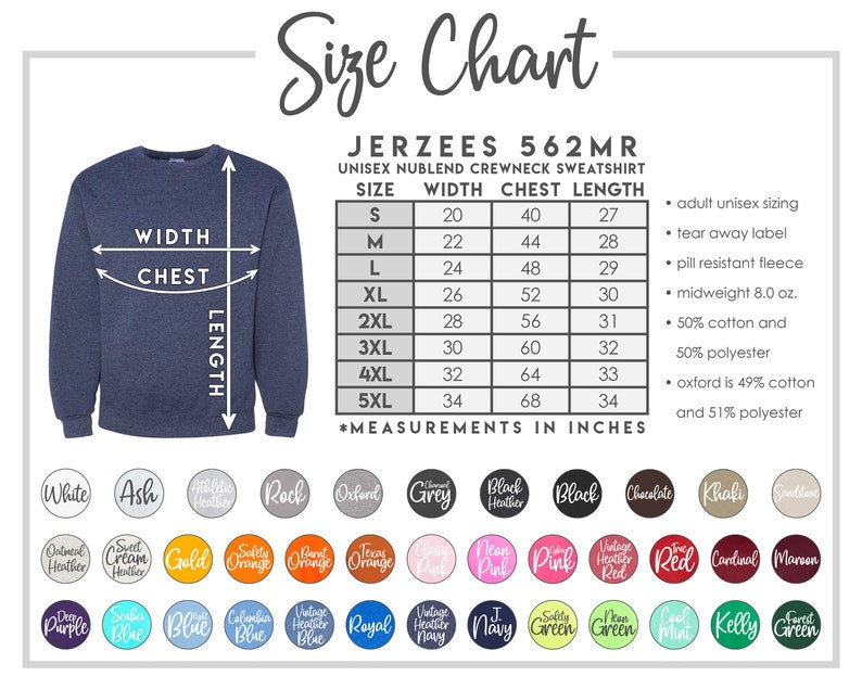 This sweatshirt is made using the Jerzees 562 blank, a 50/50 cotton-polyester blend designed for comfort and durability. It features: