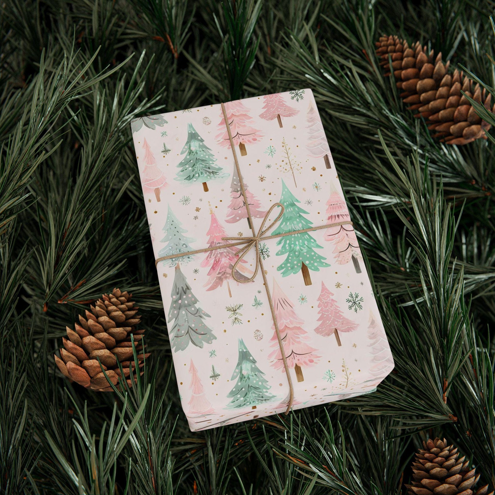 Pink Christmas Tree Wrapping Paper- Modern Holiday Gift Wrap, Watercolor Tree Print, Festive Winter Gift Wrap, Cute Pastel Christmas Decor