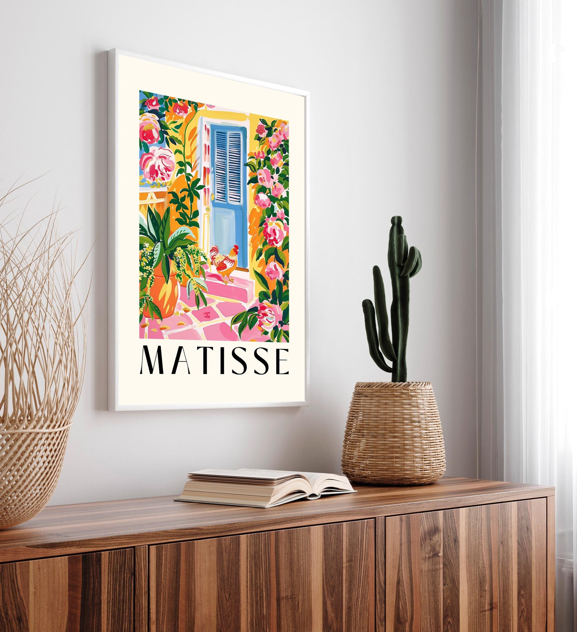 Pink farmhouse decor, Chicken art print, Tropical cowgirl poster, Hen poster, Mid century farm wall art