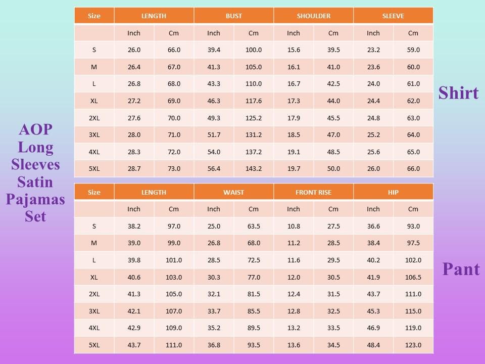1/2 Chest (in/cm) Length (in/cm) Sleeve (in/cm) Waist (in/cm) Length (in/cm) Inseam (in/cm)