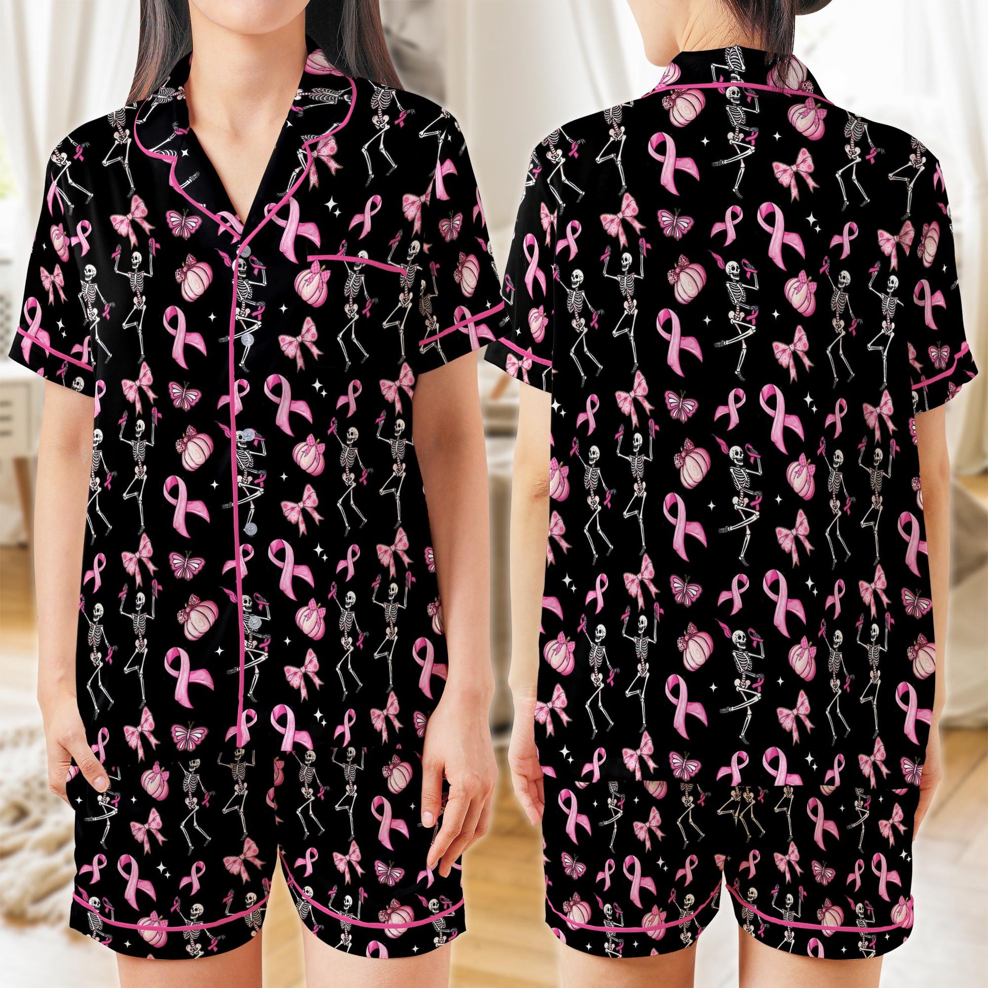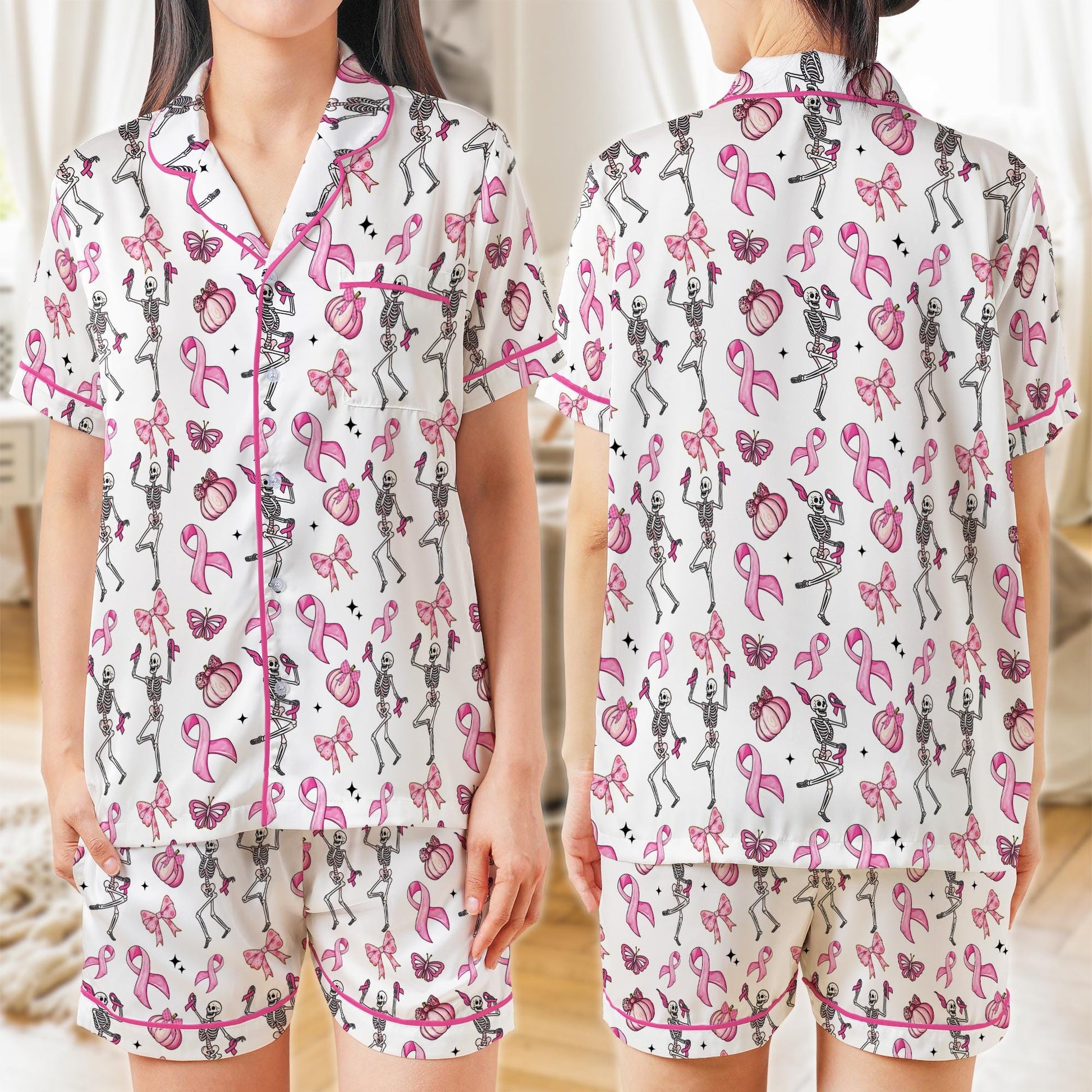 Pink Ribbon Skeleton Pajama Set, Breast Cancer Awareness Halloween Pajamas, Coquette Pumpkin Sleepwear, In October We Wear Pink Pajamas Set