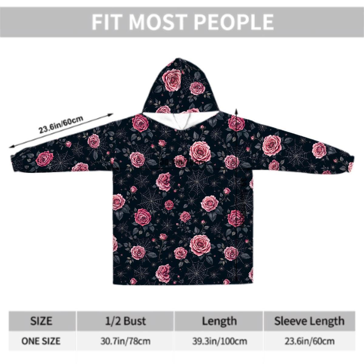 Pink Rose Spiderweb Blanket Hoodie, Boho Witchy Black Hooded Jumper, Gothic Floral Cute Winter Fall Accessory