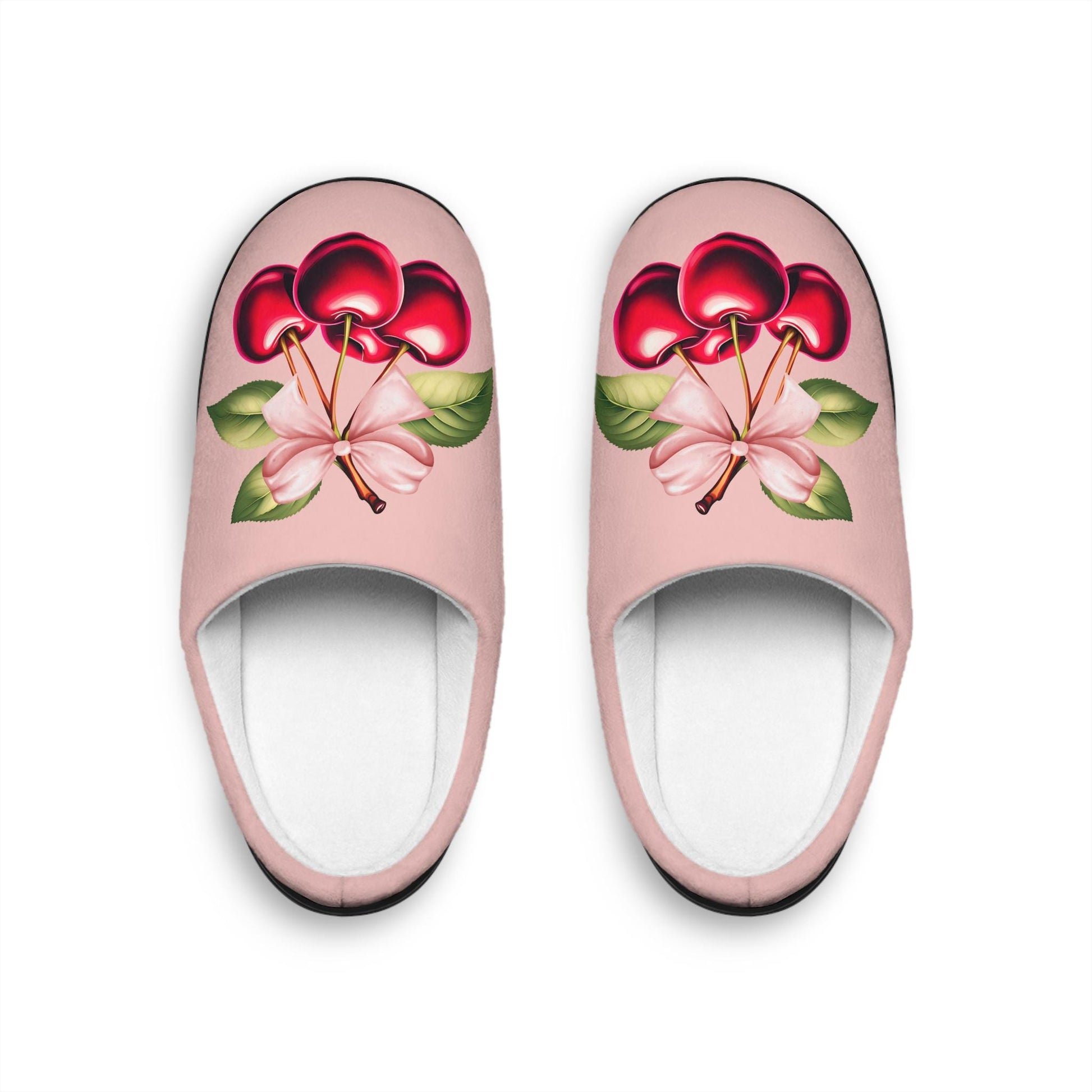 PinkCoquette PinkBow Women's Slippers DarkRed Cherries and LightPink Bow - Cute and Cozy Footwear for Everyday Comfort Fruit Cherry Slippers
