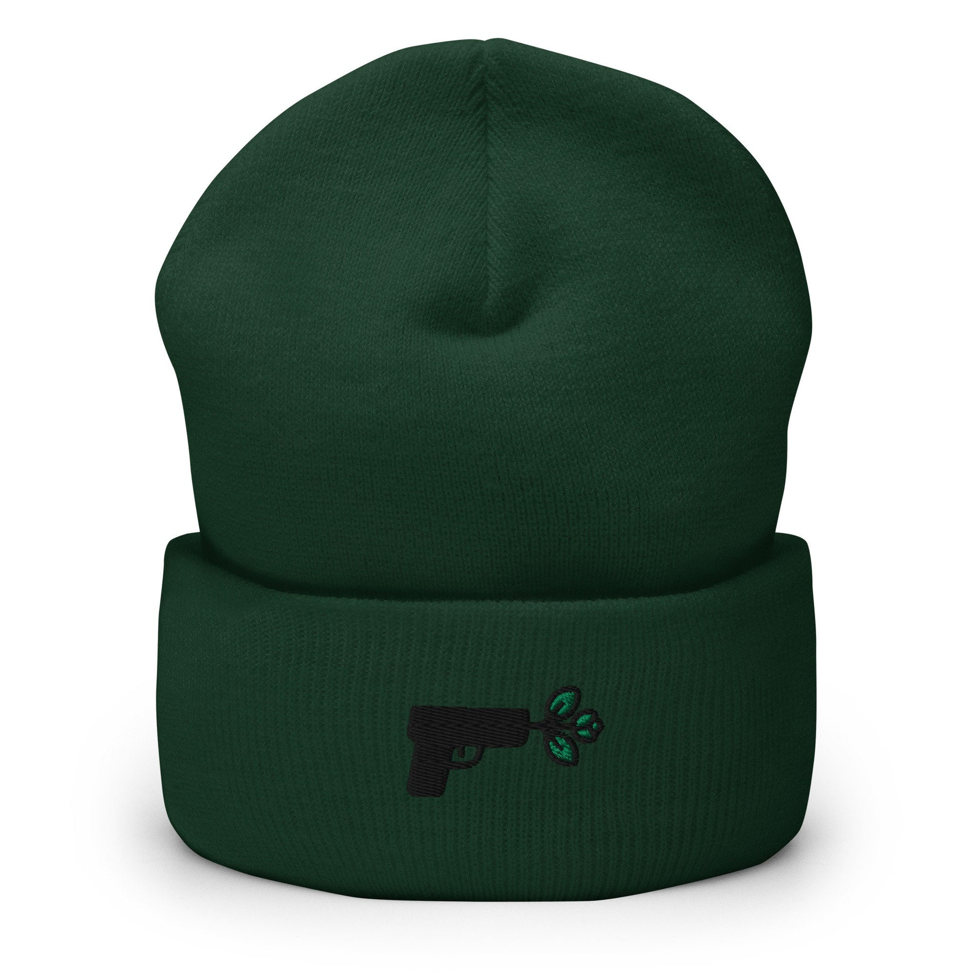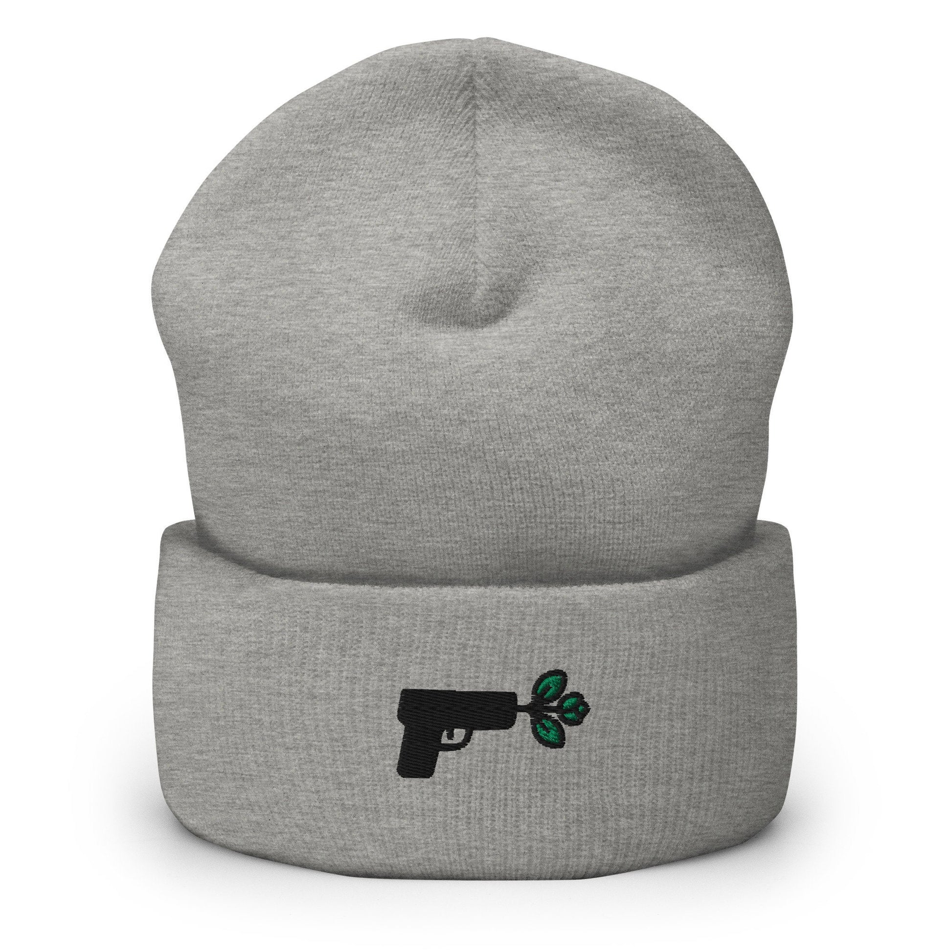 Pistol Peace Gun Embroidered Beanie, Handmade Cuffed Knit Unisex Slouchy Adult Winter Hat Cap Gift