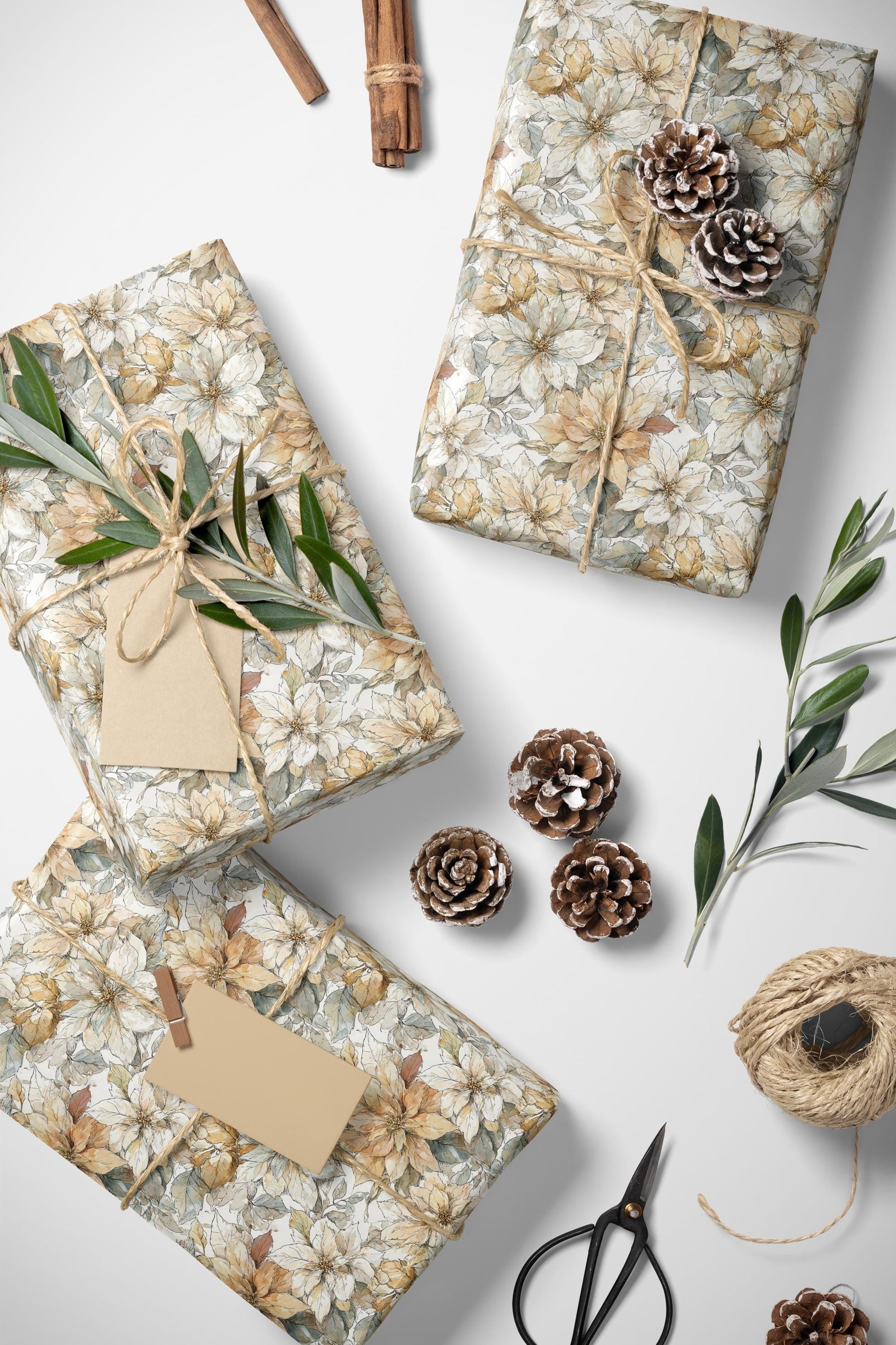 Premium Watercolor Wrapping Paper Roll with Christmas Poinsettias and Winter Floral Pattern #23
