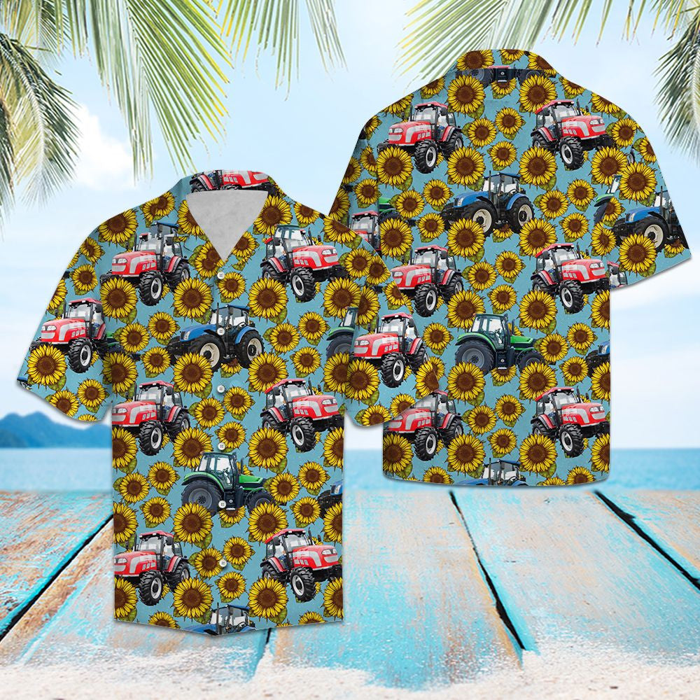 Red Stripes Tractor With Sunflowers Hawaiian Shirt,Hawaiian Shirt Gift, Christmas Gift