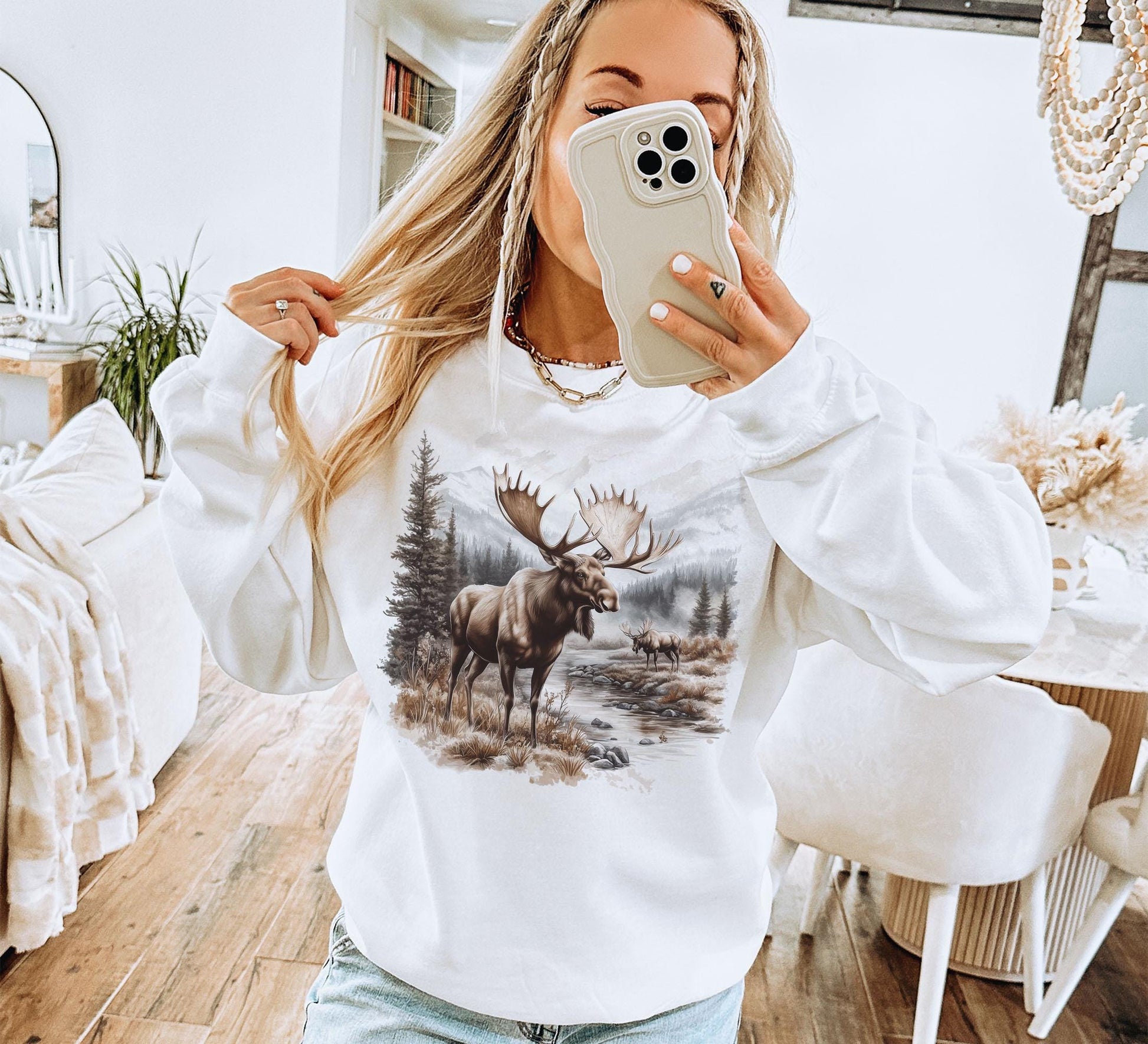 Retro Bull Moose Wilderness Scene Sweatshirt - 90s Moose Wildlife Sweatshirt - Winter Mountain Creek - Unisex Graphic Crewneck Sweatshirt