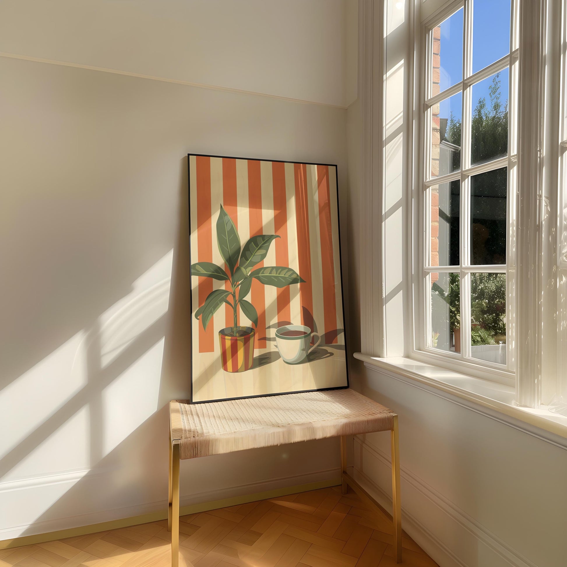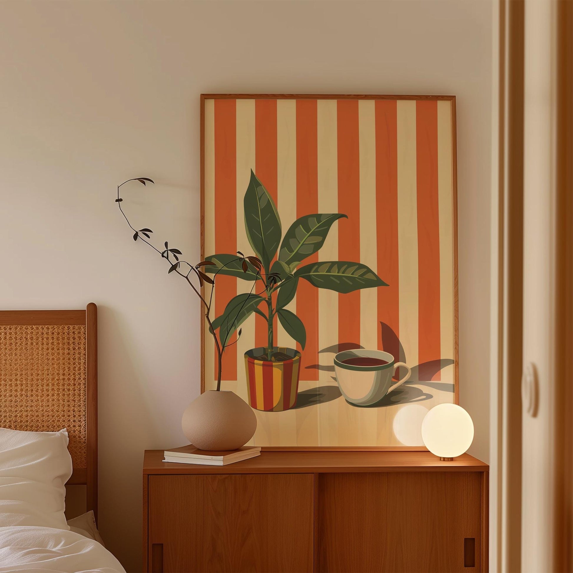 Retro Coffee Print, Retro Cafe, Coffee Art, Warm Stripes, Food Drink Kitchen Poster, Dining Room Art, Coffee Lover Gift, Plants, Minimalist