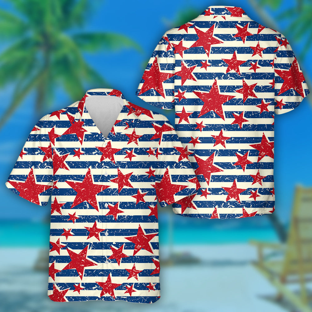 Retro Style American Red Star Blue Stripes Pattern Hawaiian Shirt, Hawaiian Shirt Gift, Christmas Gift