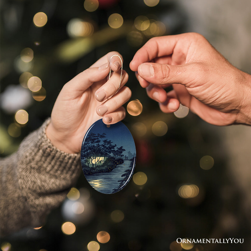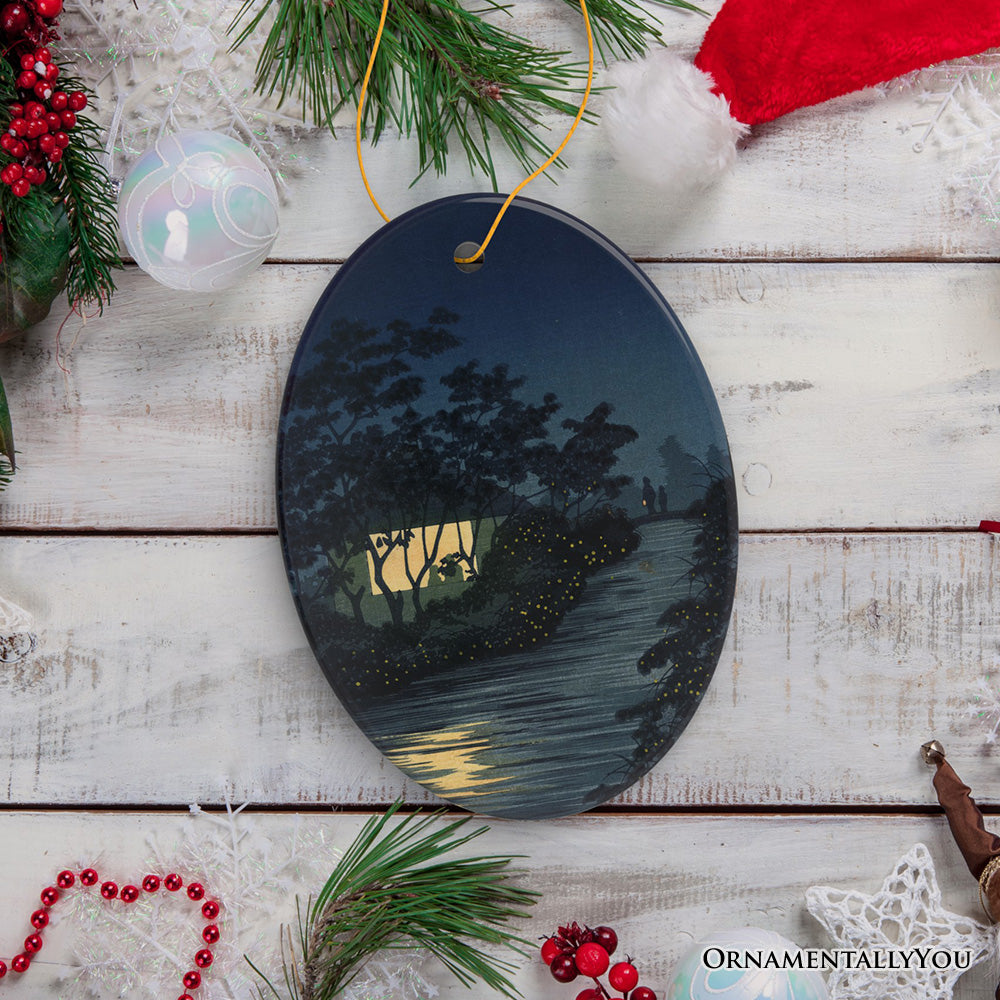 Semi-Traditional Japanese Painting Ornament, Kiyochika Kobayashi Fireflies on the Kinu River
