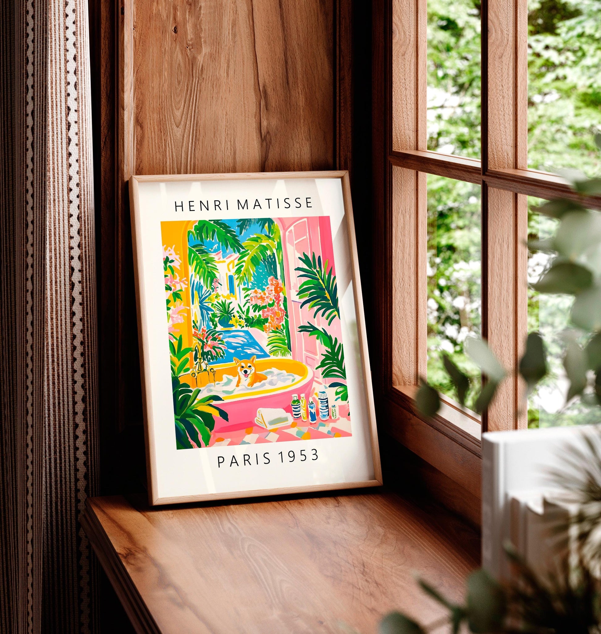 Shiba Inu Art Print: Matisse Style, Pink Bathroom Decor