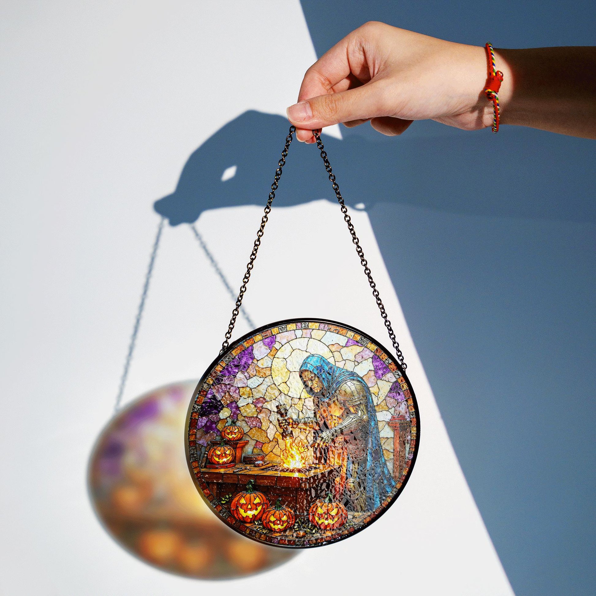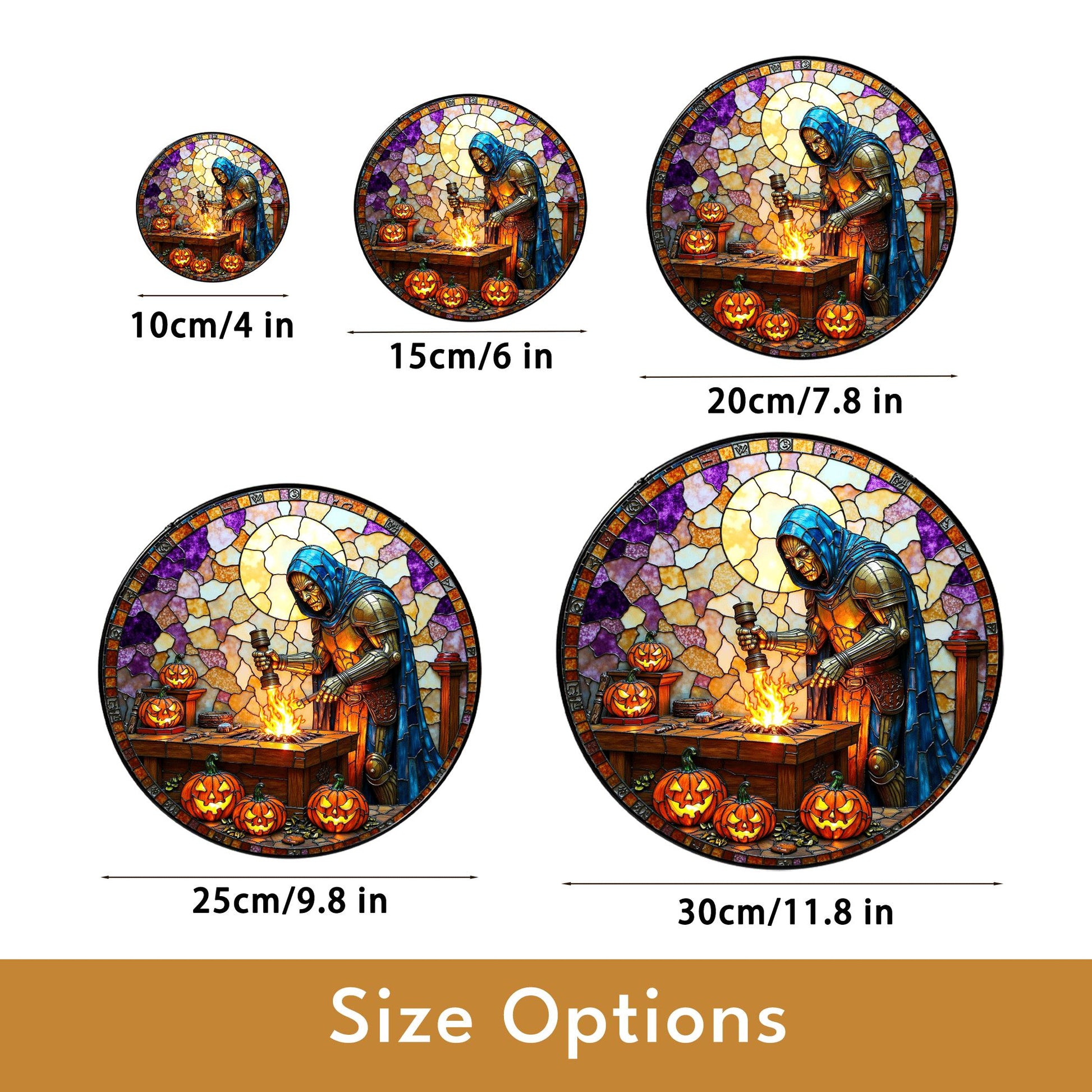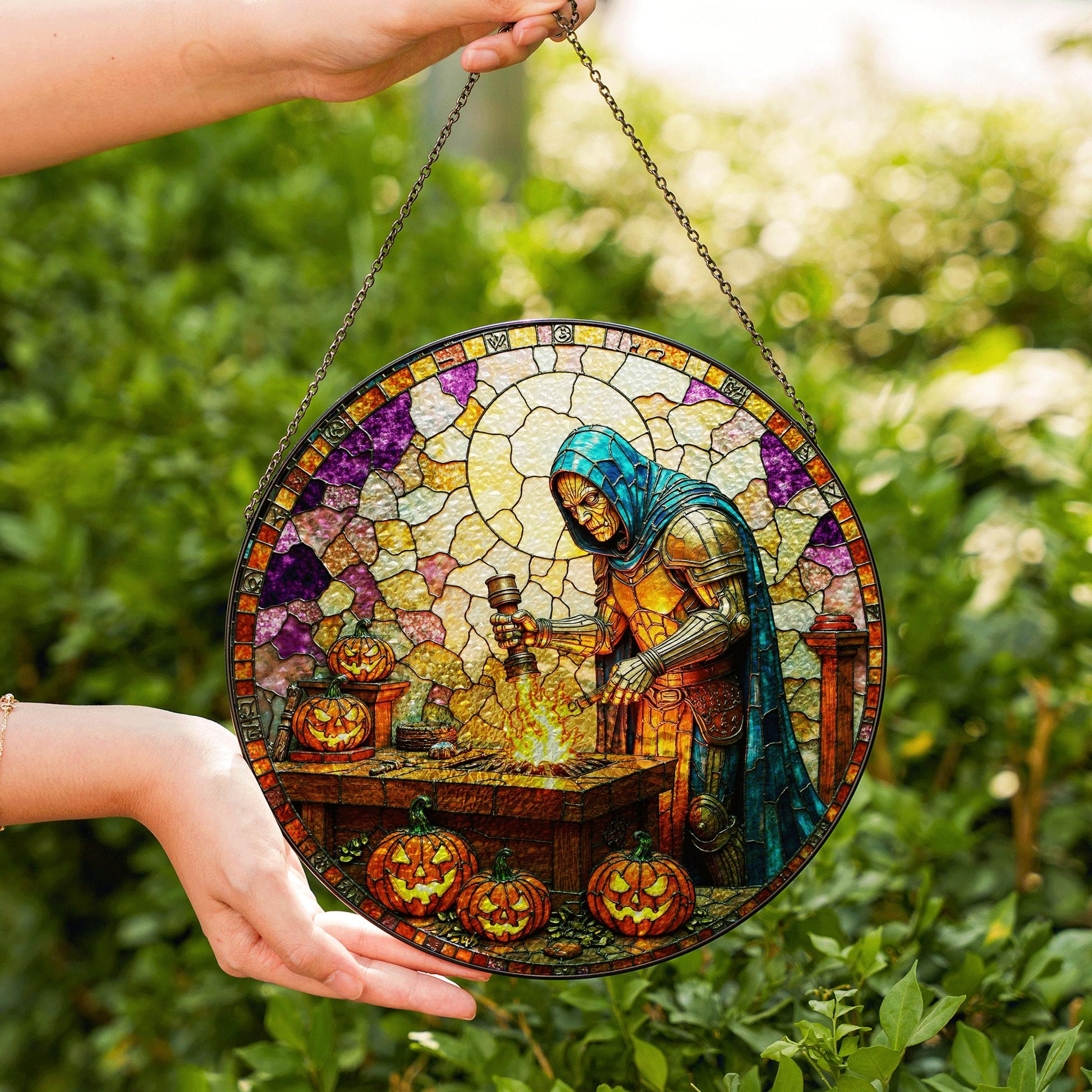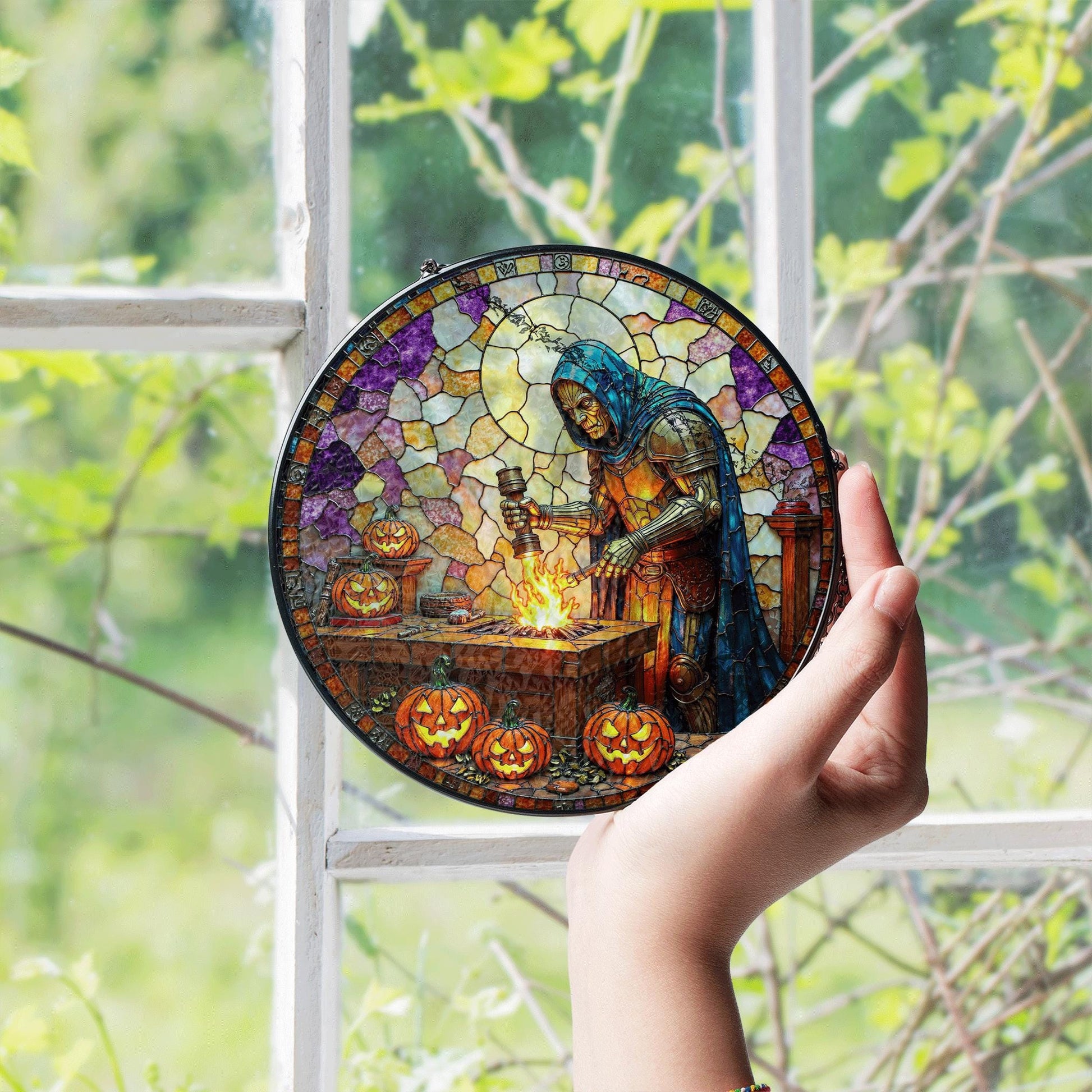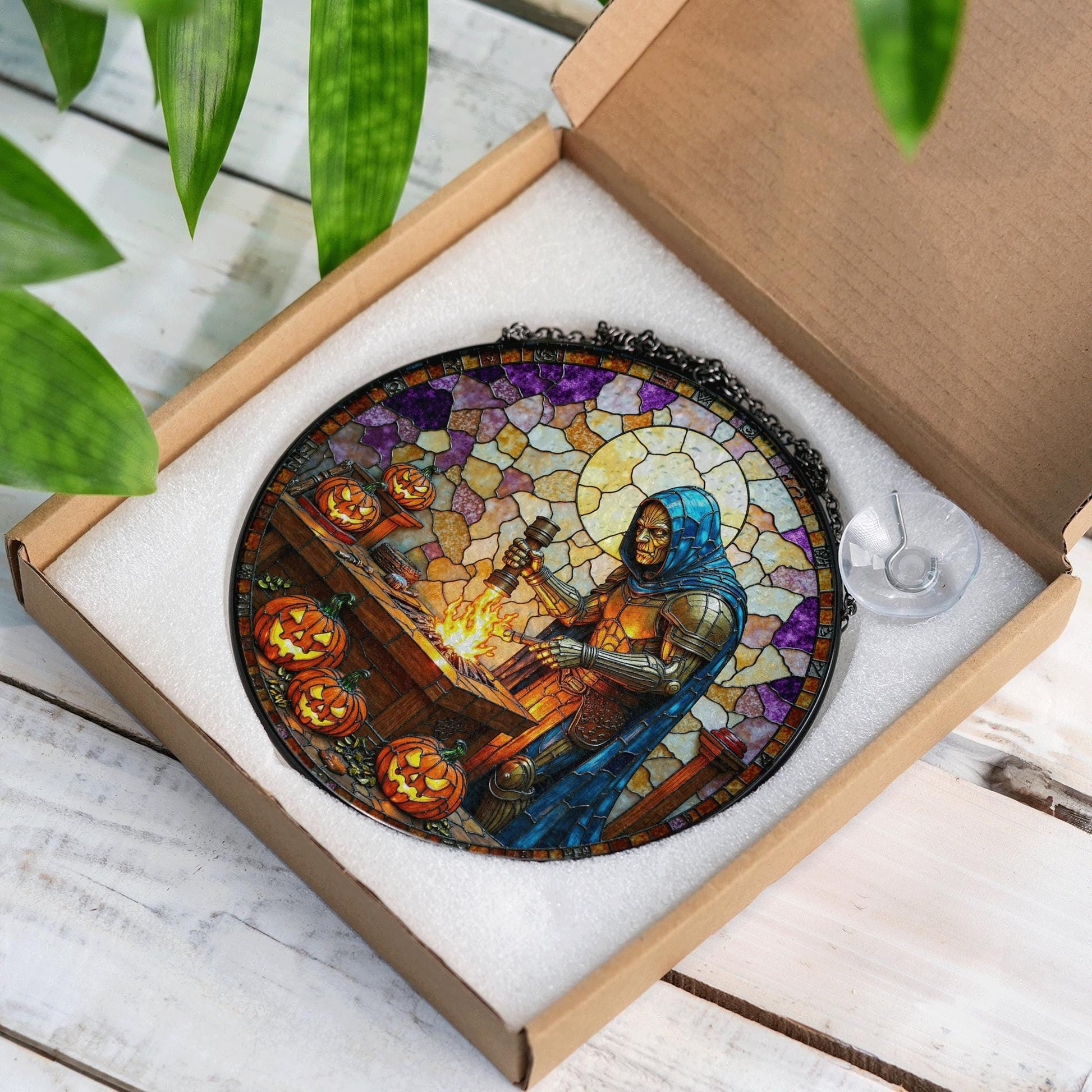 suncatcher stained glass knight forging sword with pumpkins halloween gift