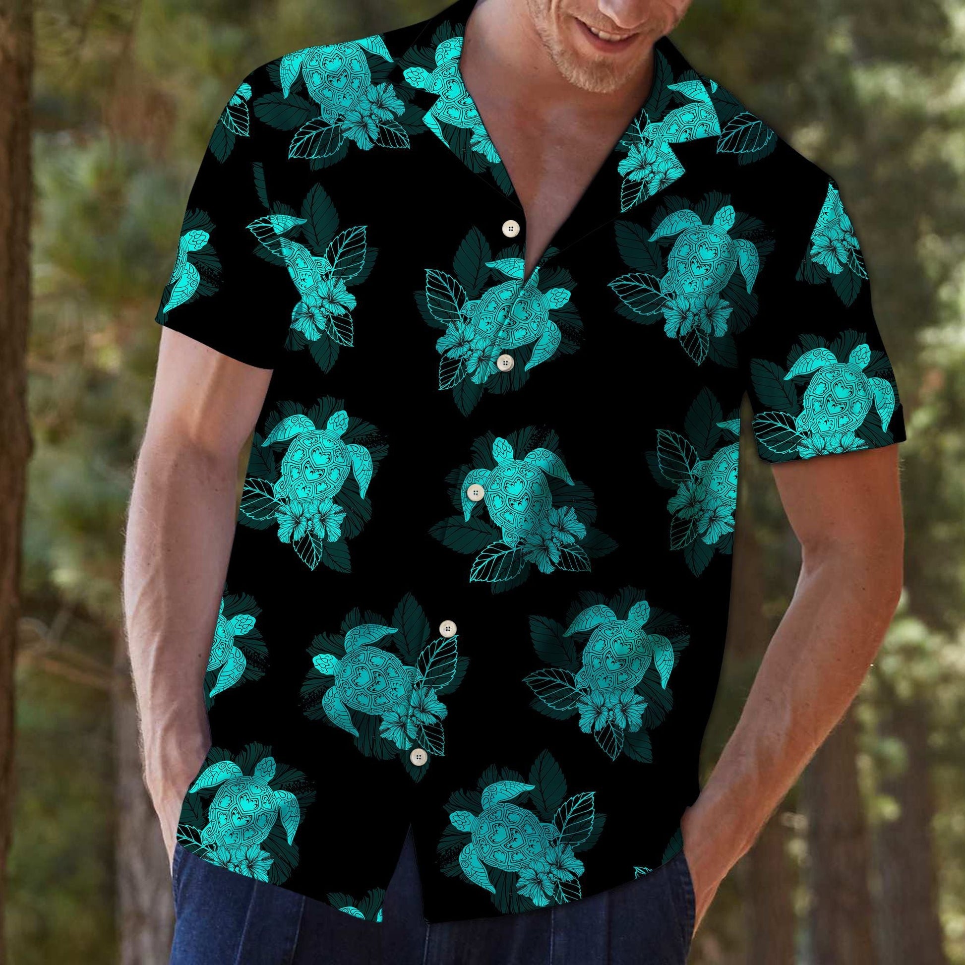 Teal And Black Turtle Summer Plant Pattern Hawaiian Shirt, Hawaiian Shirt Gift, Christmas Gift