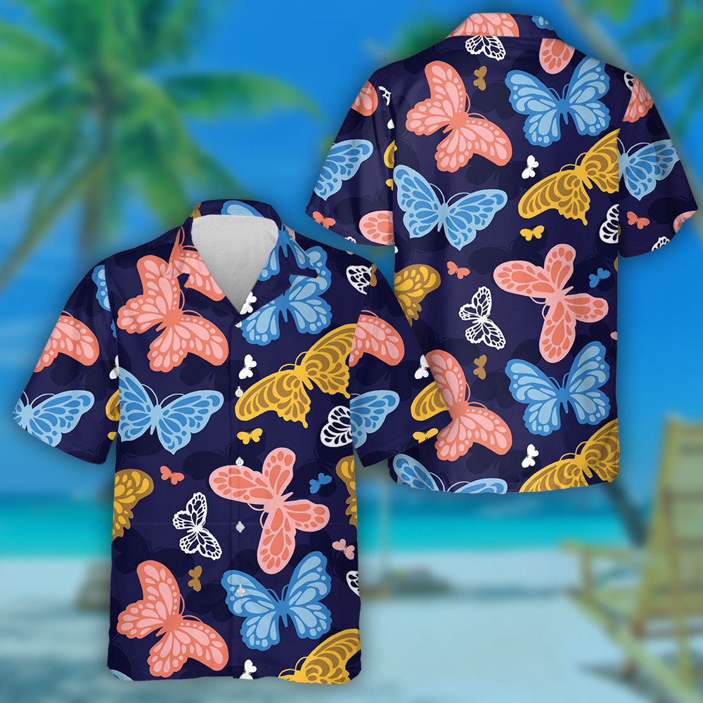 Theme Fantasy Butterflies Hand Drawn On Dark Hawaiian Shirt, Hawaiian Shirt Gift, Christmas Gift