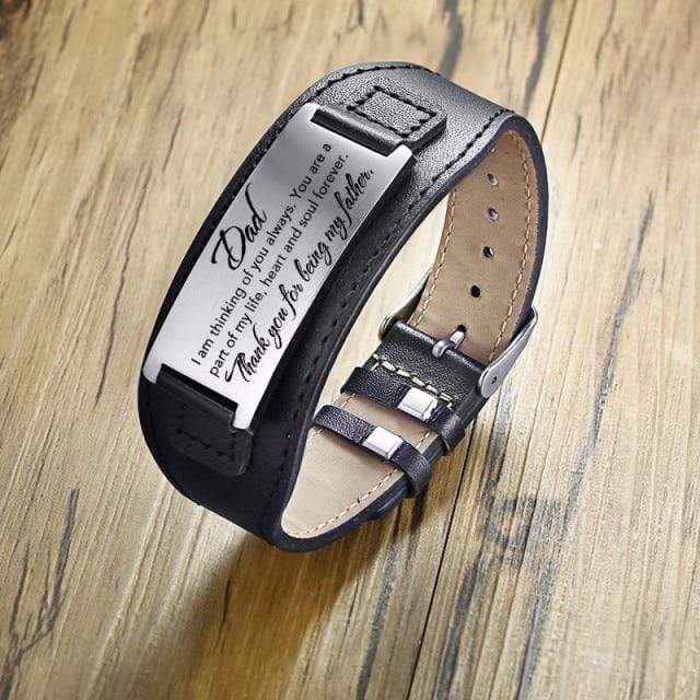 If you're looking for a perfect men's bracelet for dad or Father's day gift. This men's engraved bracelet is a perfect one! The bracelet is beautifully engraved with a meaningful message to show how much you love your dad and always be grateful to him. Also, the strap of the bracelet is made from leather material with a high-strength safety clasp. It will be an awesome bracelet to make him happy absolutely!