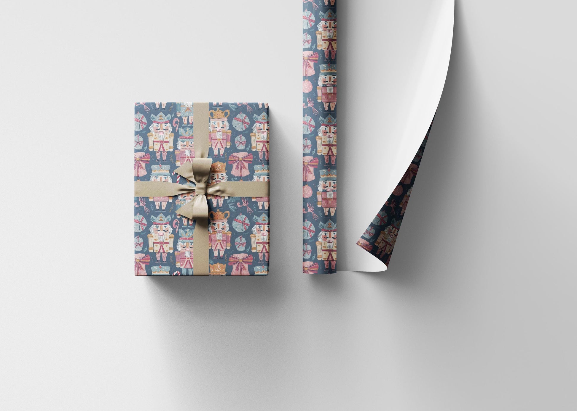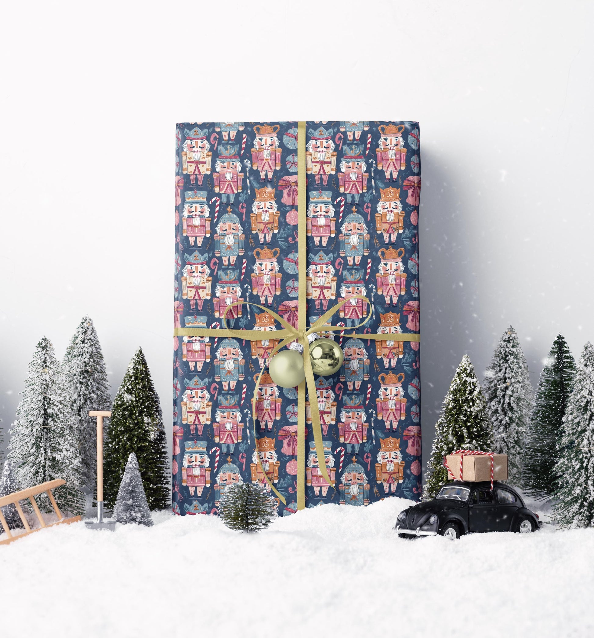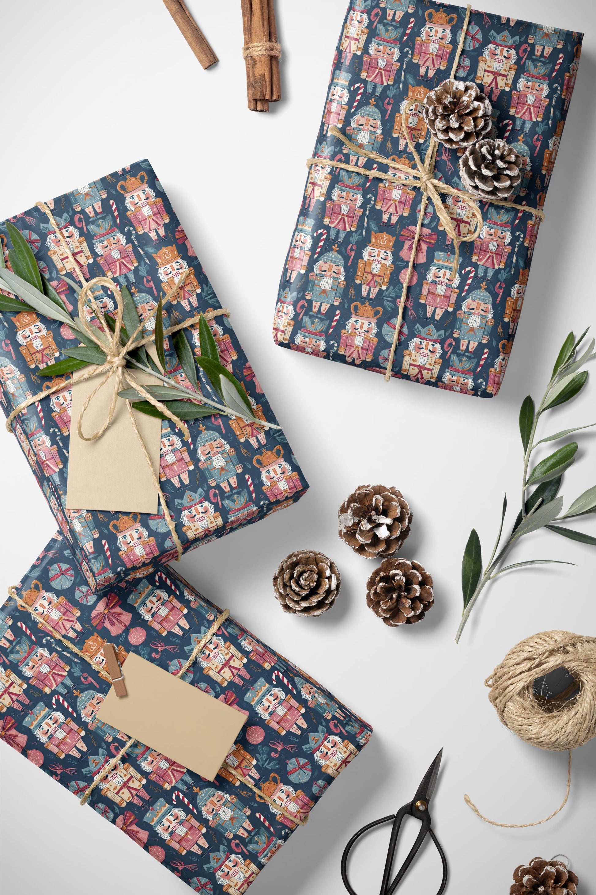 Traditional Christmas Wrapping Paper Roll with Nutcracker Figures and Holiday Ornaments #9