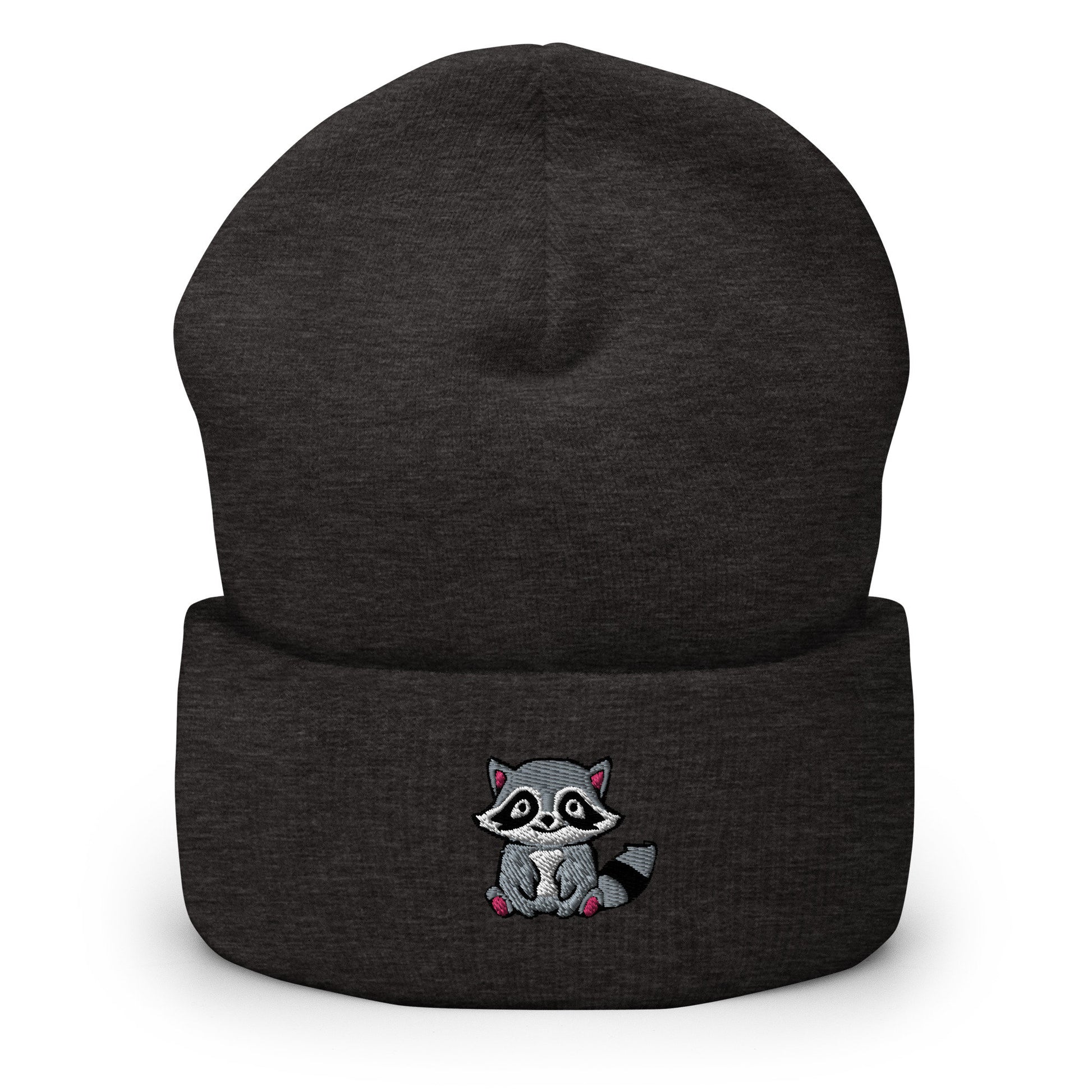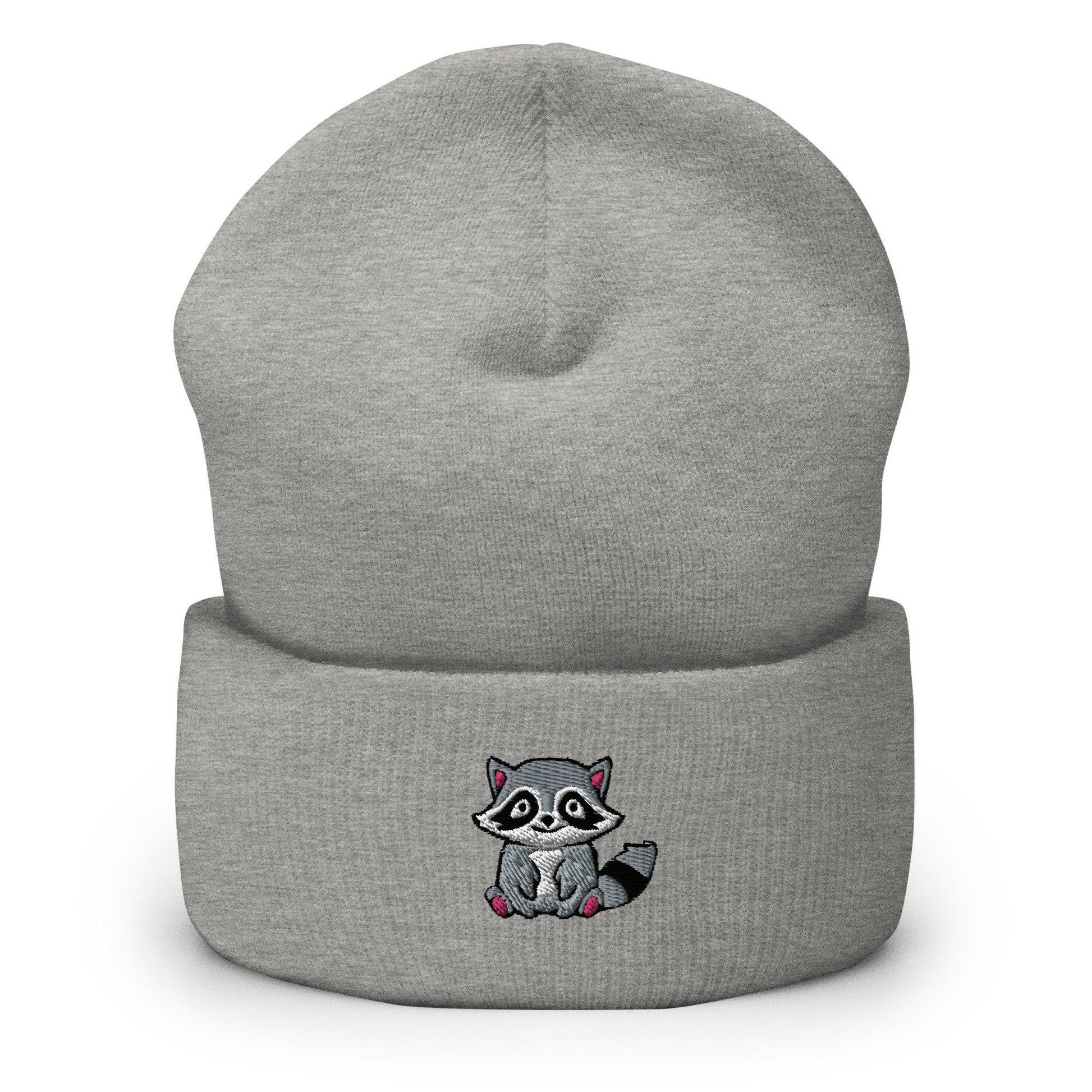 Trash Panda Raccoon Embroidered Beanie, Handmade Cuffed Knit Unisex Slouchy Adult Winter Hat Cap Gift