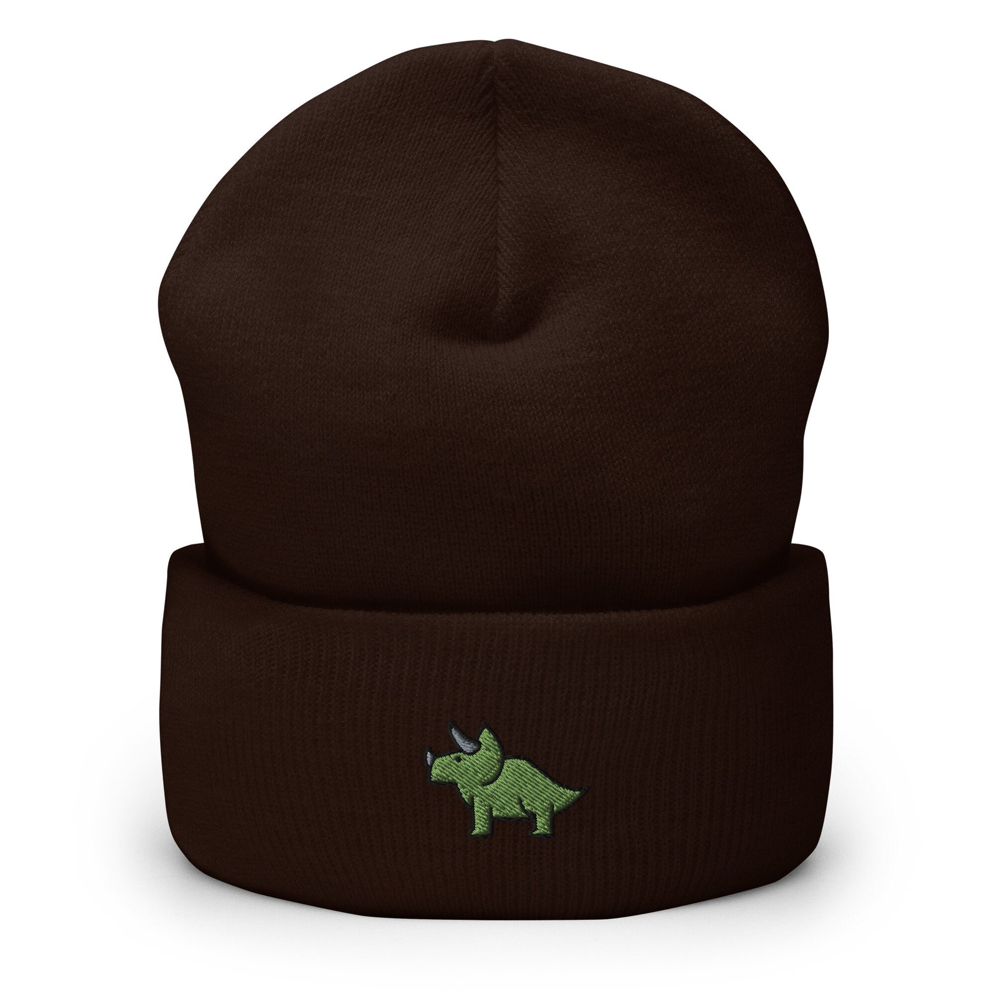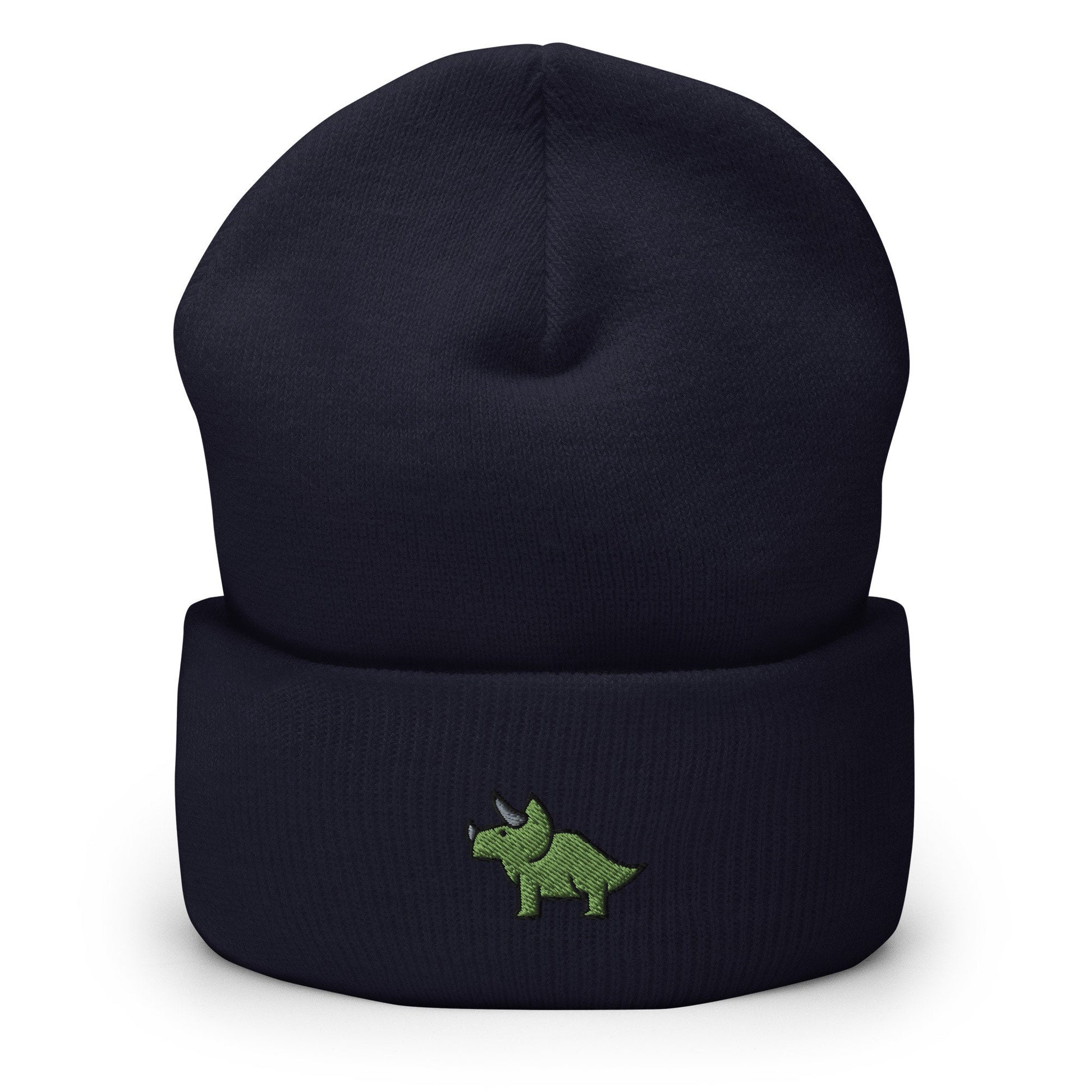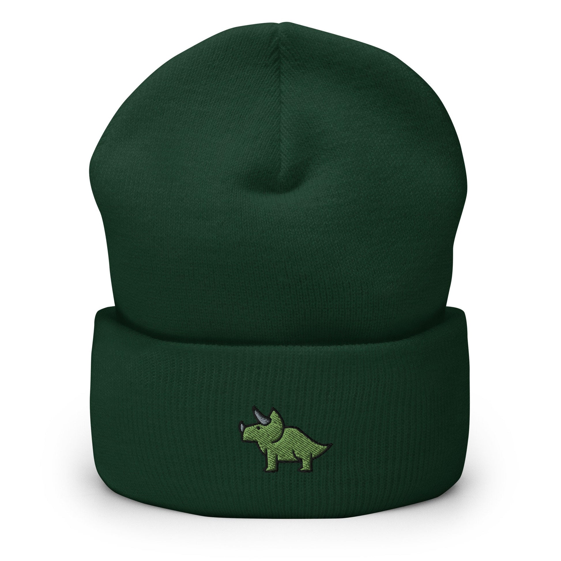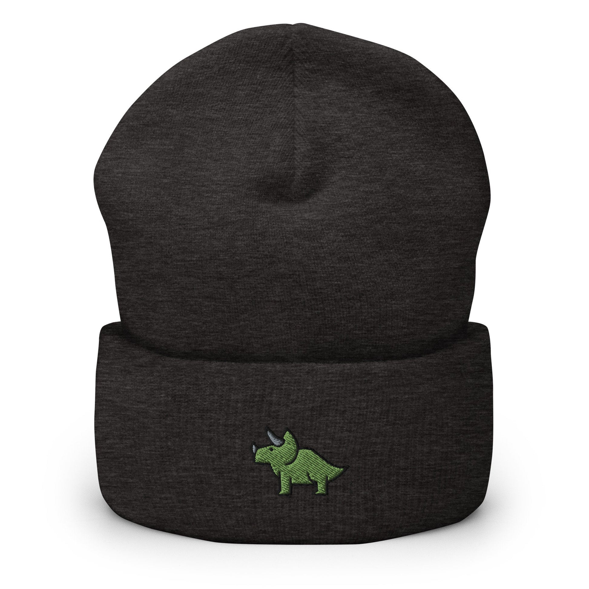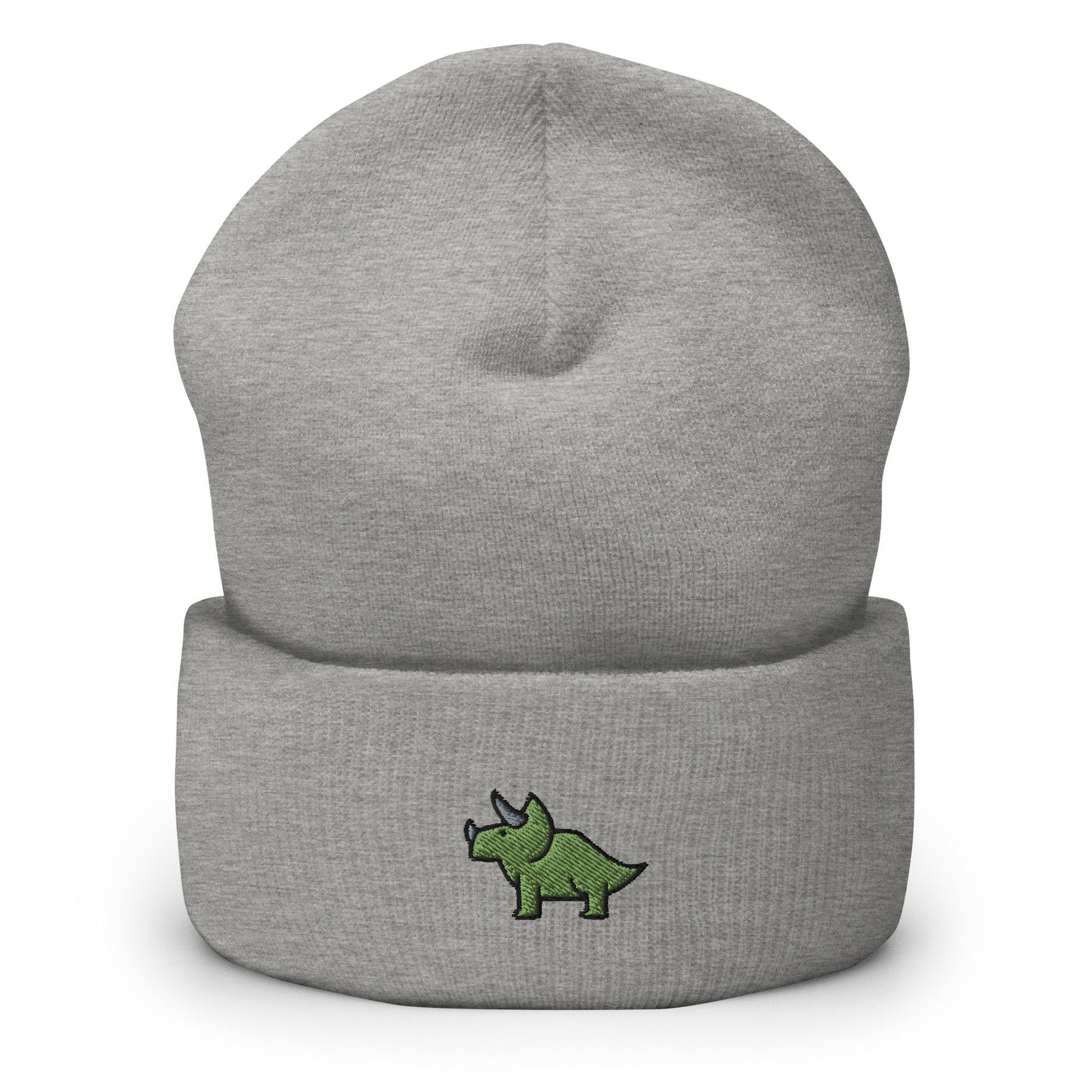 Triceratops Dinosaur Embroidered Beanie, Handmade Cuffed Knit Unisex Slouchy Adult Winter Hat Cap Gift