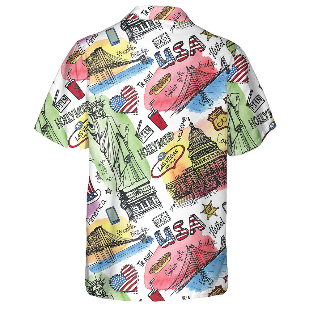 Watercolor New York Symbols Doodle Art Hawaiian Shirt, Hwaiian For Gift