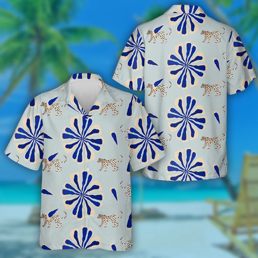 Wild African Leopard With Bright Turquoise Flowers Hawaiian Shirt, Hawaiian Shirt Gift, Christmas Gift