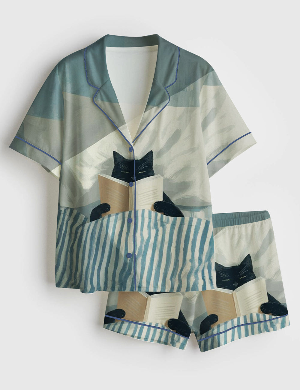 Women’s Black Cat Reading Print Cozy Cat Book Lover Short Sleeve Satin Pajama Set