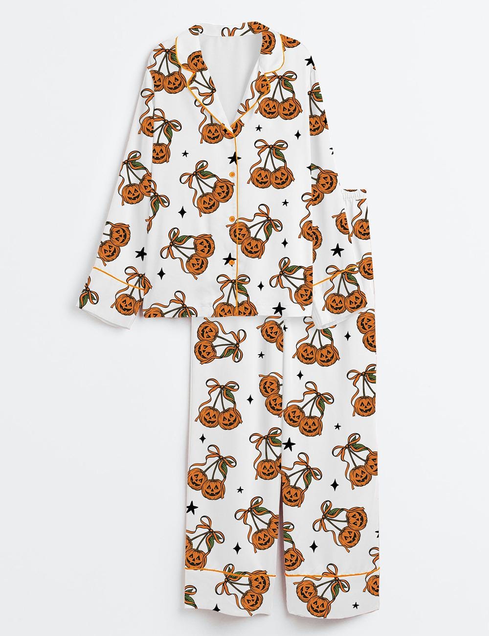 Women’s Halloween Pumpkin Cheeries Coquette Short Sleeve Satin Pajama Set, Womens Pumpkin Pajamas Cheeries Gift Pjs