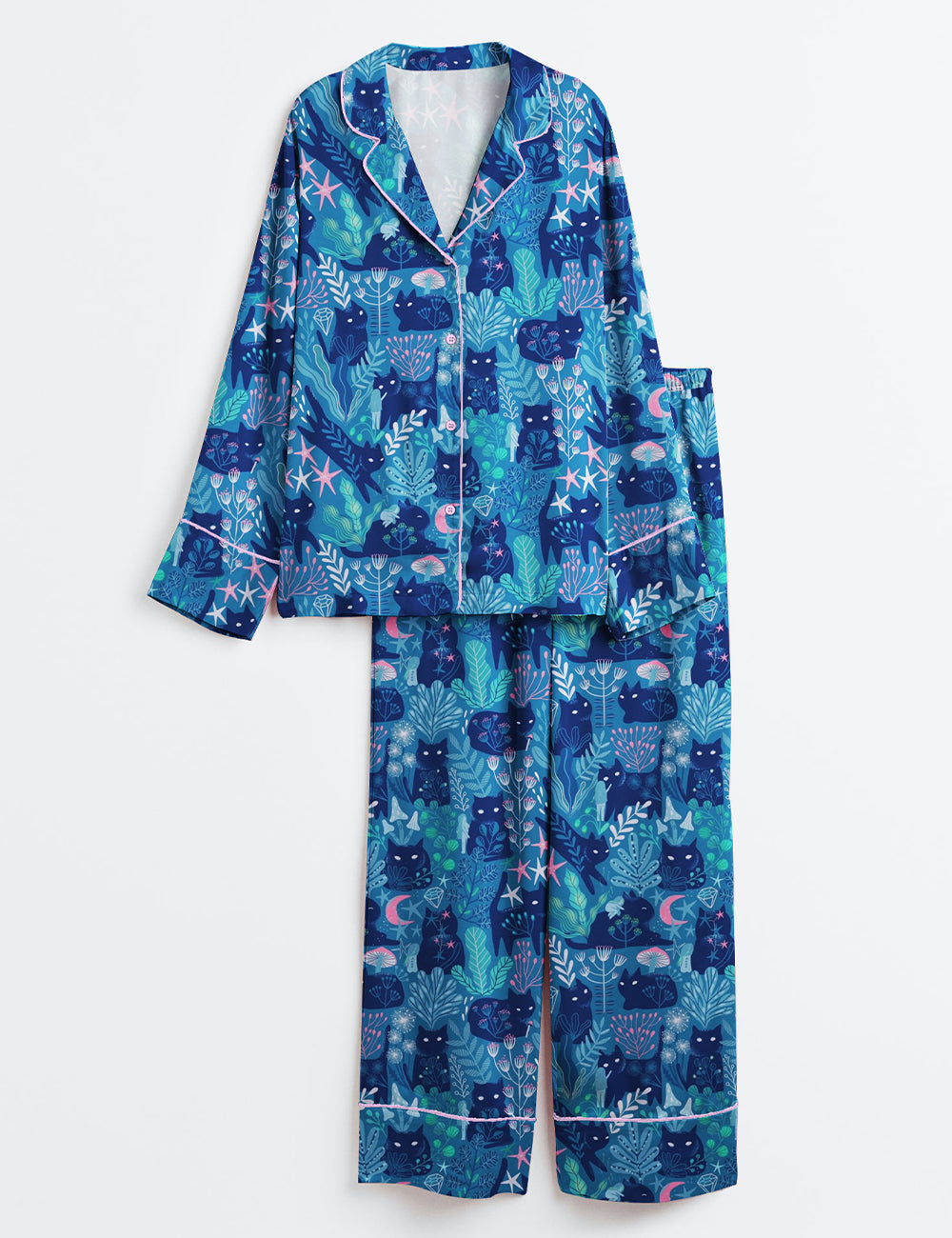 Women’s Meowgical Friends Plants And Flowers Halloween Cat Long Sleeve Satin Pajama Set
