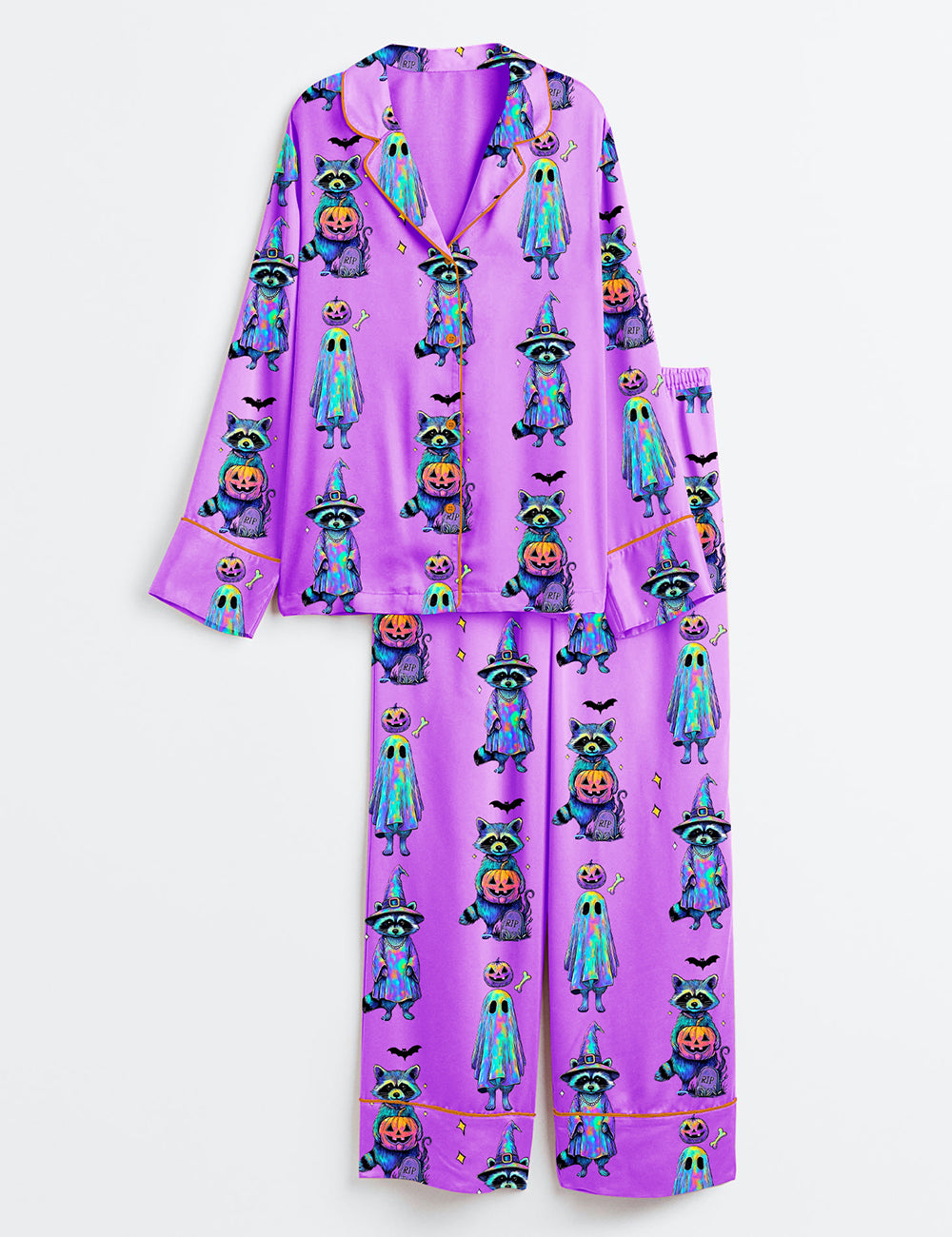 Women’s Spooky And Feral Raccoon Halloween Pumpkin Long Sleeve Satin Pajama Set