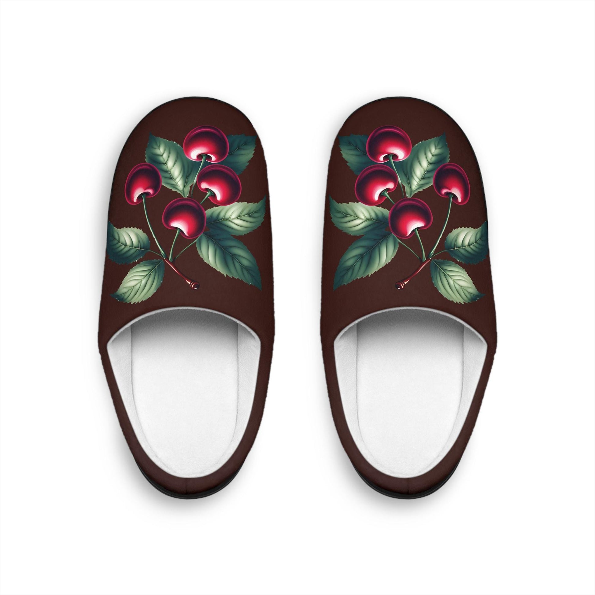 Women'sSlippers Chocolatebrown Dark Redcherry Design w/ Greenleaves Gift-for-mom Gift-for Grandma Gift For Dessertlover Gift For Fruitlovers