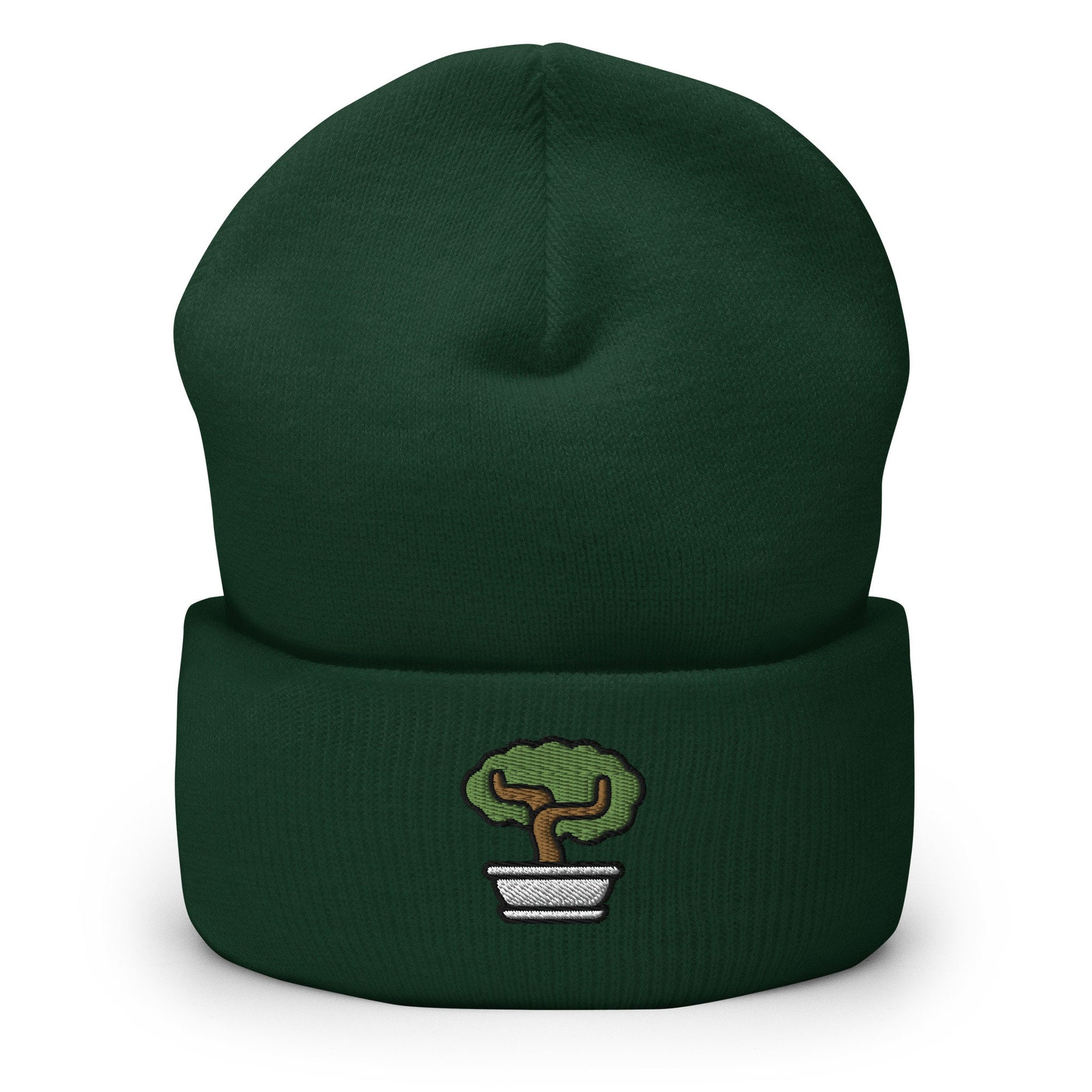Zen Tree, Gardening Bonsai Tree Embroidered Beanie, Handmade Cuffed Knit Unisex Slouchy Adult Winter Hat Cap Gift